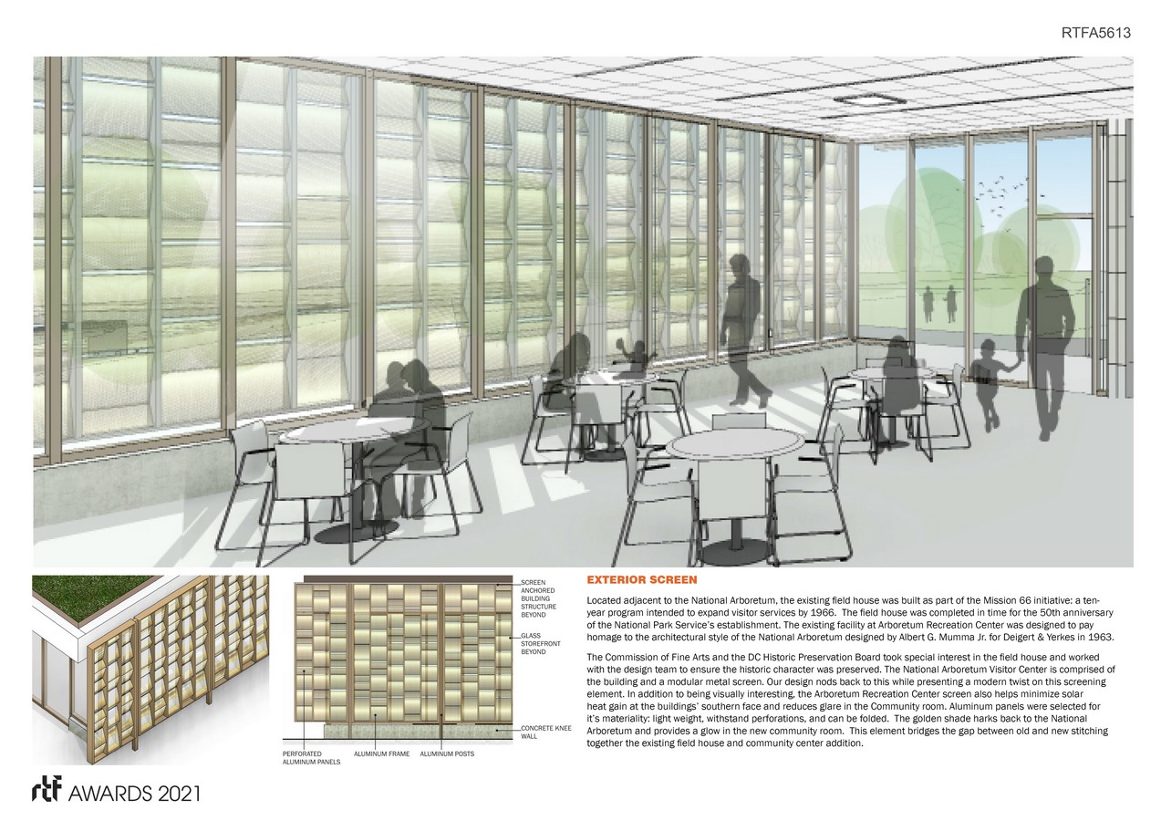 By creating a building that plays with level changes and materiality we can enhance flexibility of space and find a harmony between the mid-century modern Field House and the New Addition. A homage to the adjacent Arboretum can also be found in the decision to create a flow between exterior and interior throughout the project and the metal screen brings a modern take to an existing formula. The design for the Arboretum Recreation Center fuses form, function, and sustainability.
