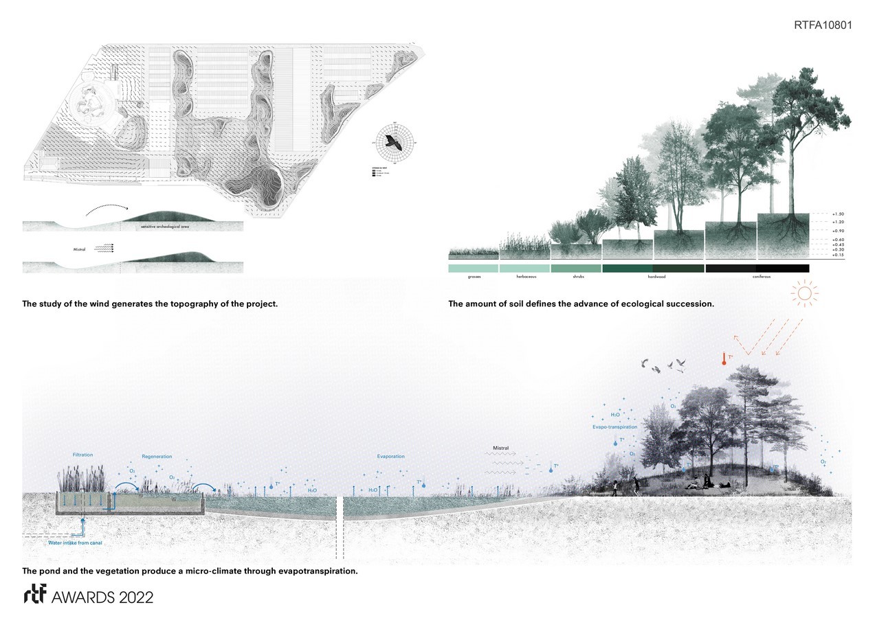 We wondered what nature would have done over time. We modelled how the northern mistral winds would gradually blow sediments to the site, accumulating into a new fertile topography on top of the dead rocks. The resulting dune-like landscape produces a new space-time relationship : the higher the elevation of the dune, the more time would have passed to create it.