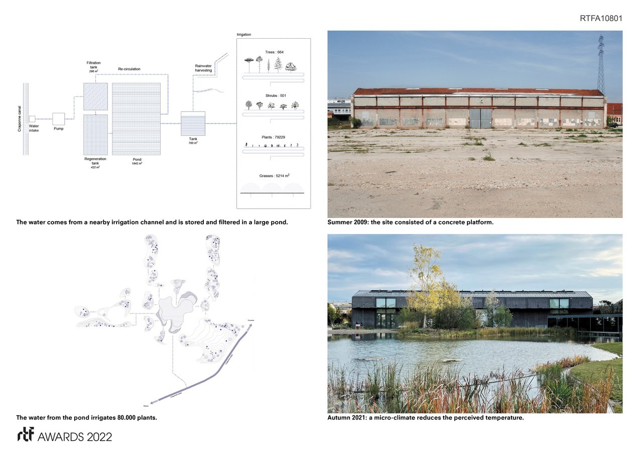 The vegetation is irrigated by a sustainable water system that draws its source from the nearby Craponne Canal. Its water is pumped into a central pond where it is naturally filtered by the aquatic plants. The pond serves as a reservoir for the plant irrigation and as a cooling device for the park. The combined evapotranspiration of the pond and the vegetation produces a micro-climate that transforms the former concrete semi-desert into a Mediterranean climate.