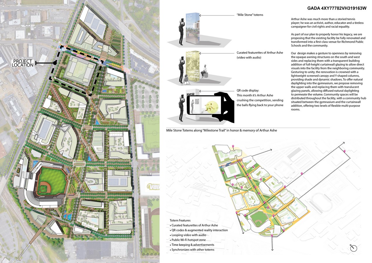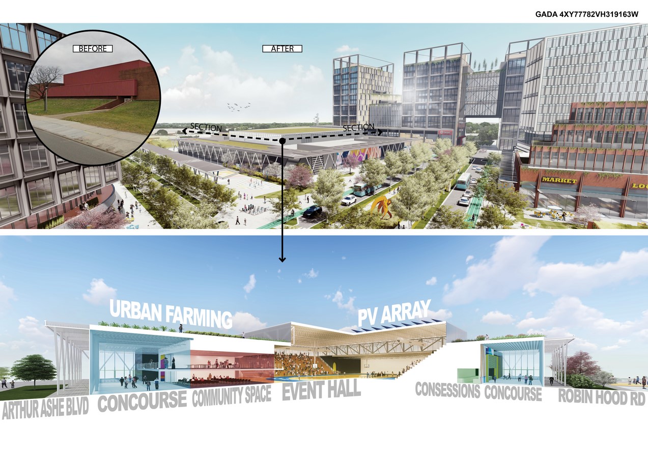 Honoring Ashe’s athletic achievements and activism, the proposed renovation of the existing facility as part of the Diamond District redevelopment initiative aims to embody the spirit of unity, resilience, and openness while tearing down literal and metaphorical barriers and unifying communities. The new program calls for a resilient “refresh” (light to moderate renovation) of both the interior and exterior while maintaining the core of the existing walls and footprint. Therefore, we prioritized the offering of 1) community spaces, 2) natural daylighting, and 3) connections to the surrounding community. The facility now becomes both a vibrant place of athletic activity and a venue for learning and gathering.