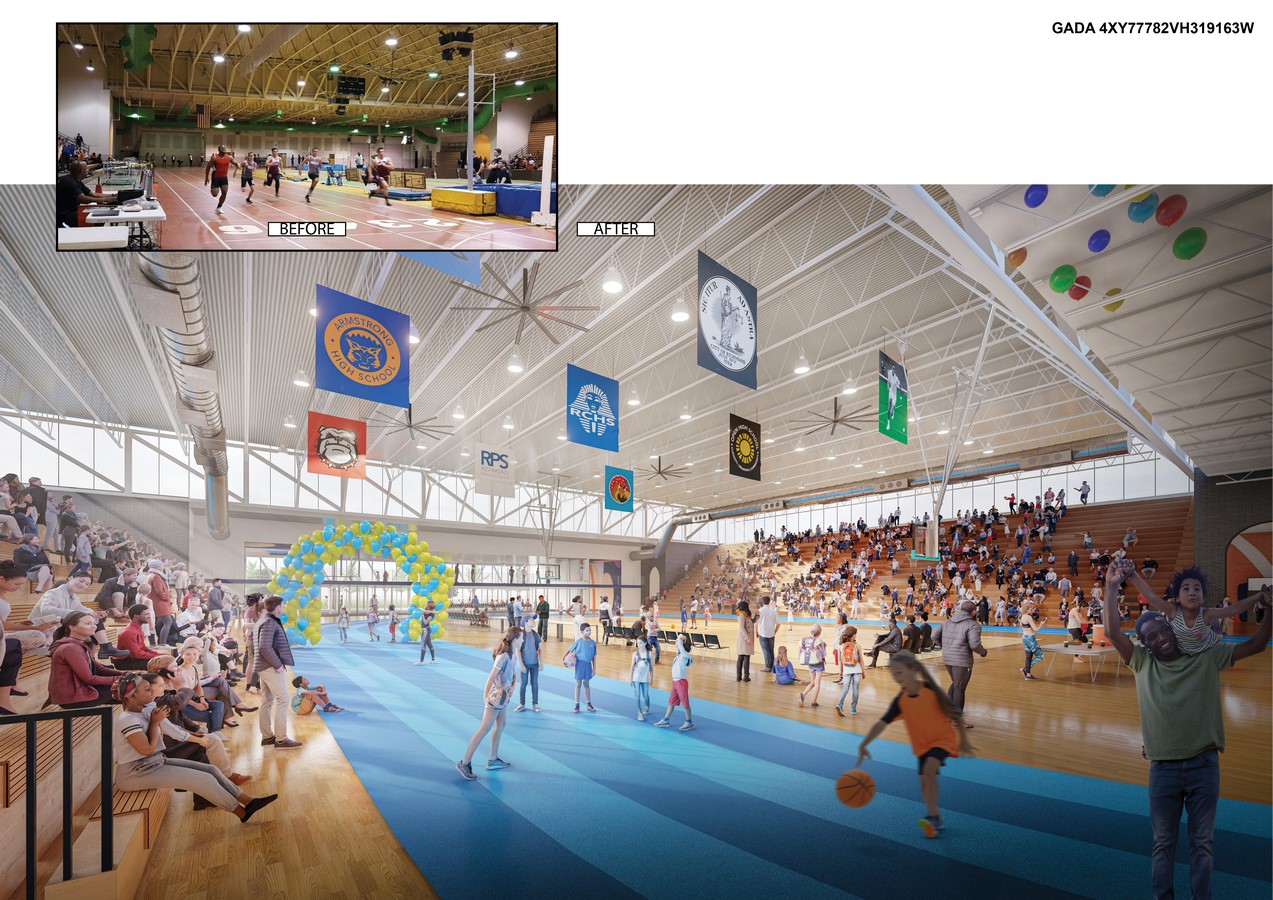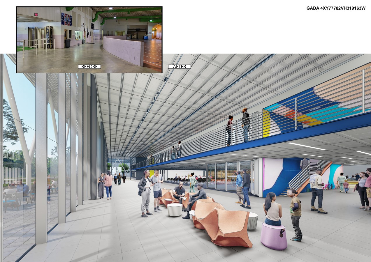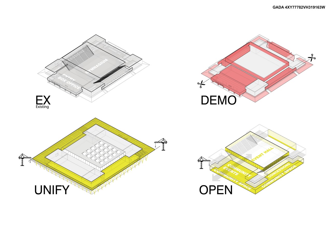 The design gestures to openness by removing the opaque awning structures on the south and west sides and replacing them with a transparent building addition of full-height curtainwall glazing, allowing direct visuals into the facility from the neighboring community. Signaling unity, the renovation is crowned with a lightweight screened canopy and Y-shaped columns, providing shade and dynamic shadows. To offer natural daylighting into the gymnasium, we propose removing the upper walls and replacing them with translucent glazing panels, allowing diffused natural daylighting to permeate the volume. Community spaces are distributed throughout the renovation, with a community hub situated between the gymnasium and the curtainwall addition, offering two levels of flexible multi-purpose rooms.