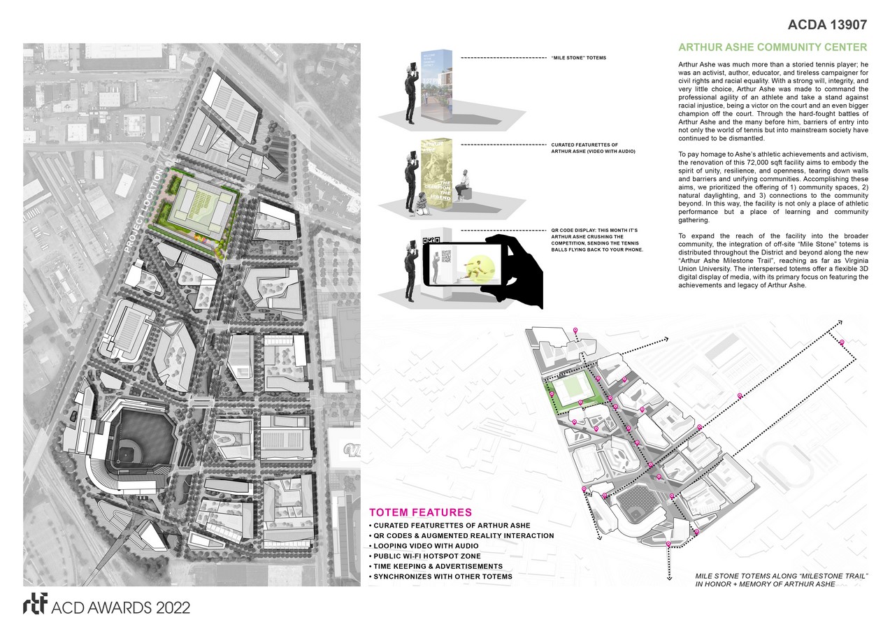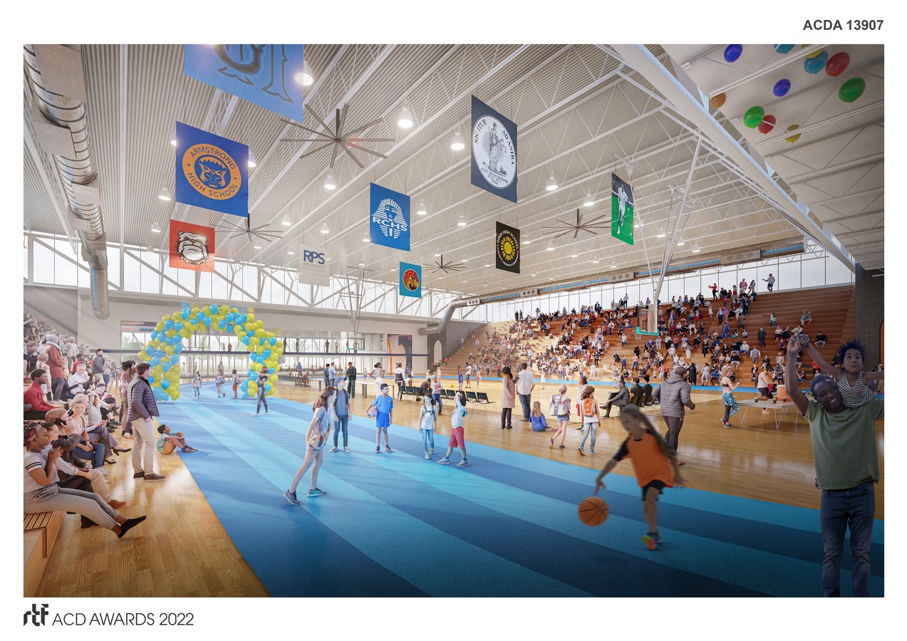 Honoring Ashe’s athletic achievements and activism, the proposed renovation of the existing facility as part of the Diamond District redevelopment initiative aims to embody the spirit of unity, resilience, and openness while tearing down literal and metaphorical barriers and unifying communities. The new program calls for a resilient “refresh” (light to moderate renovation) of both the interior and exterior while maintaining the core of the existing walls and footprint. Therefore, we prioritized the offering of 1) community spaces, 2) natural daylighting, and 3) connections to the surrounding community. The facility now becomes both a vibrant place of athletic activity and a venue for learning and gathering.