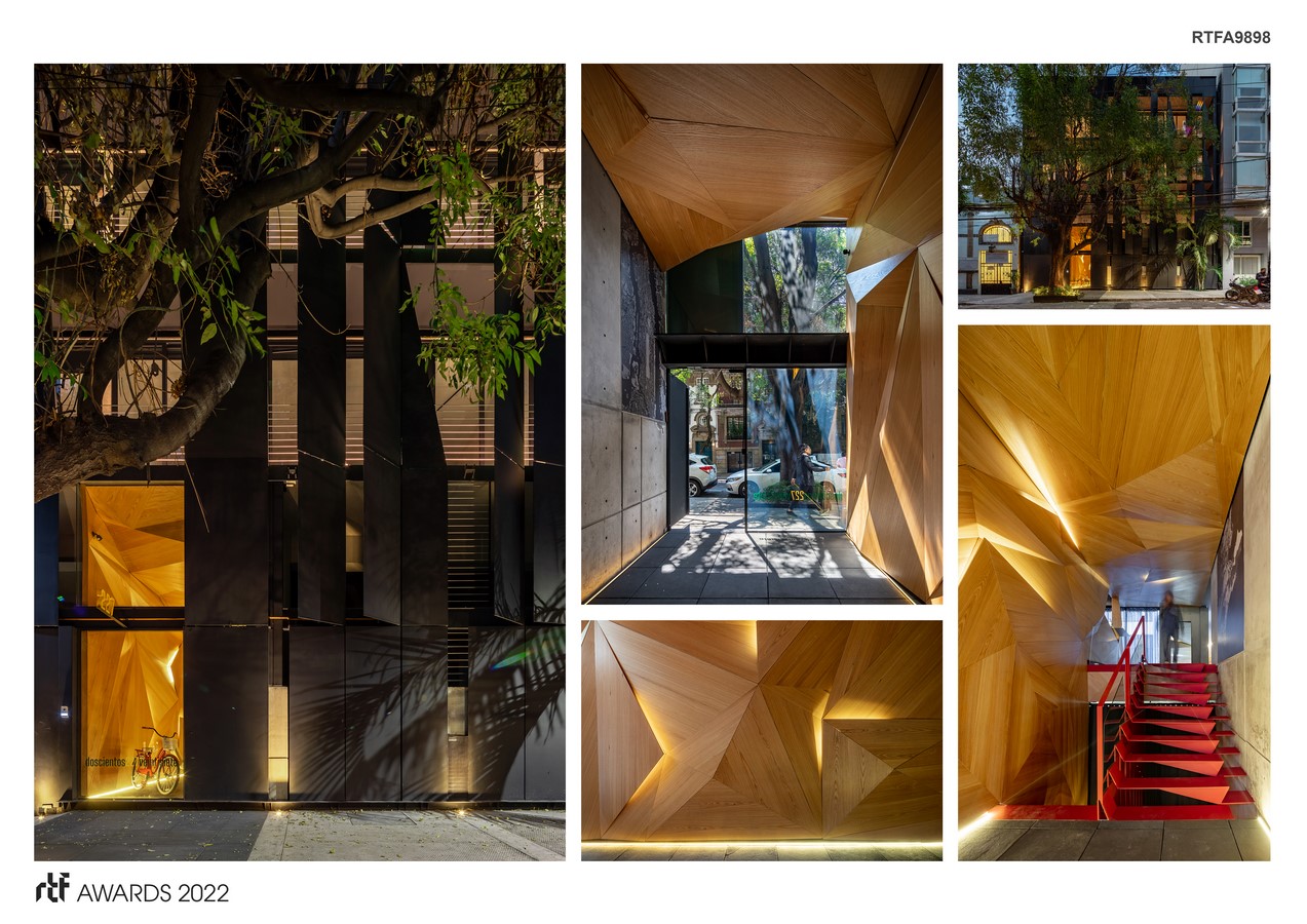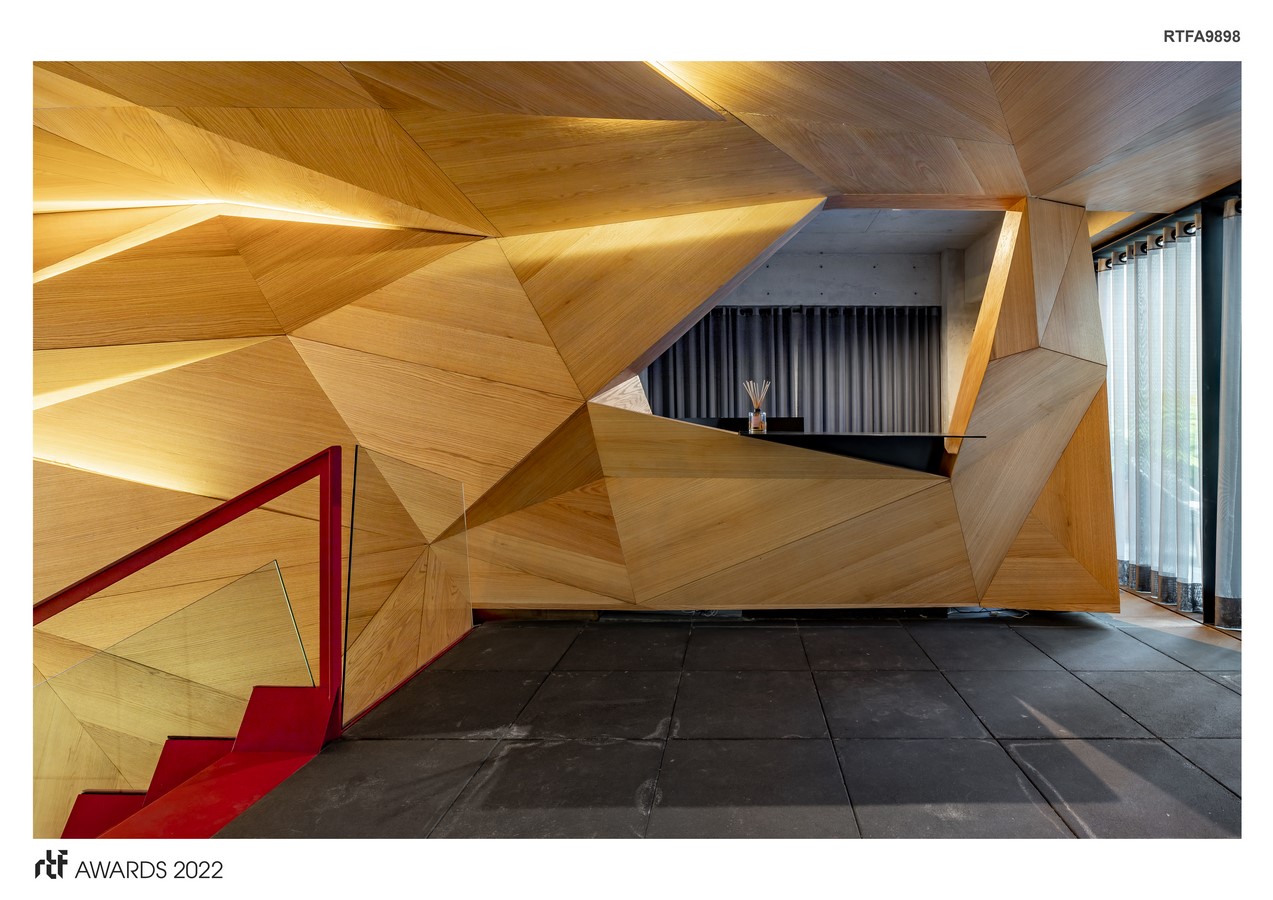 The lobby peeks out until the main facade with a wooden wall the unfolds like origami between the wall and ceiling, it incorporates a sculptural staircase and concludes in the reception desk. Every element is integrated as a single piece that generates a dynamism that is experienced from the street to the room.