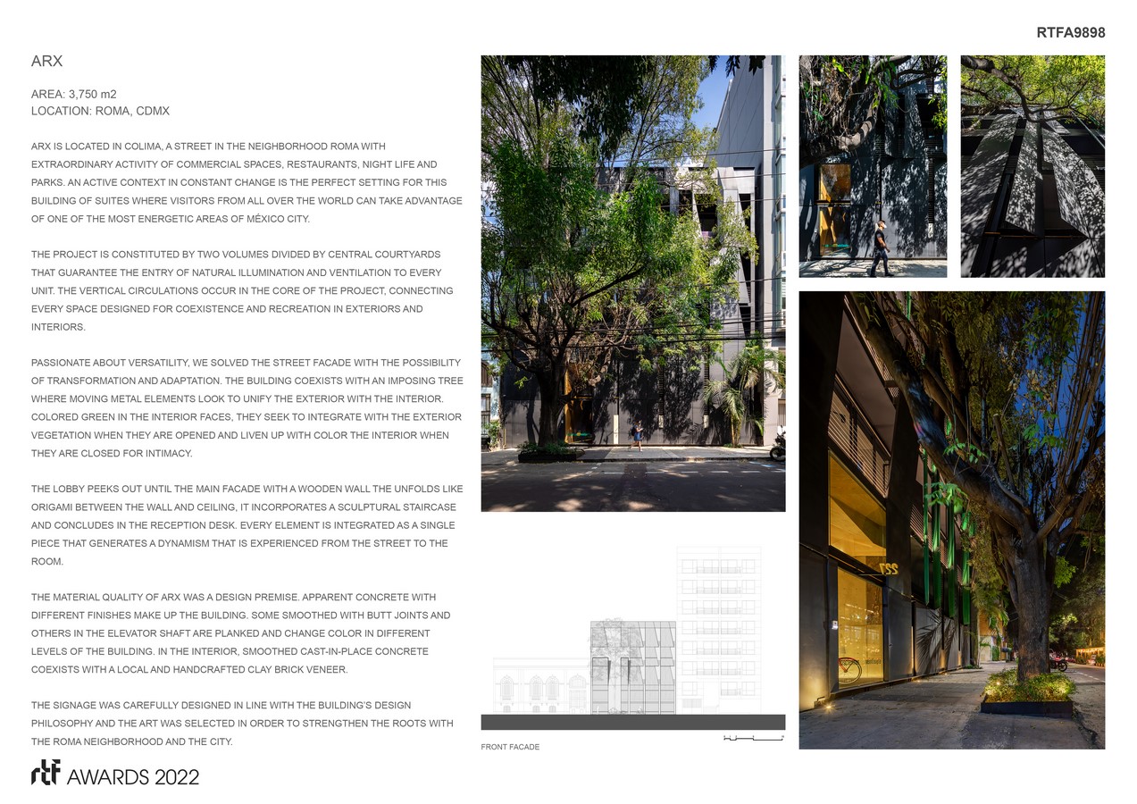 ARX is located in Colima, a street in the neighborhood Roma with extraordinary activity of commercial spaces, restaurants, night life and parks. An active context in constant change is the perfect setting for this building of suites where visitors from all over the world can take advantage of one of the most energetic areas of México City.