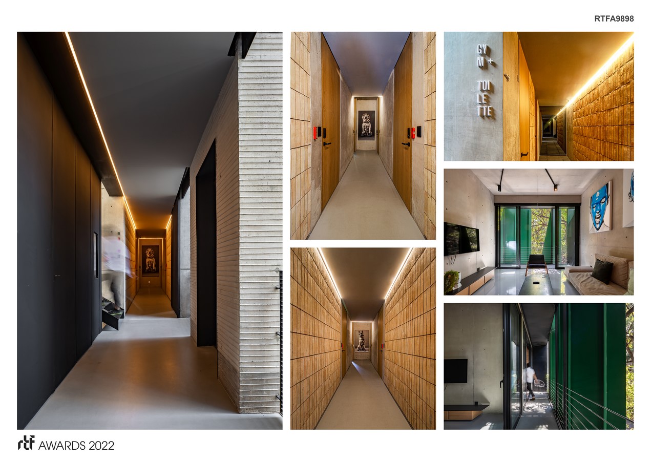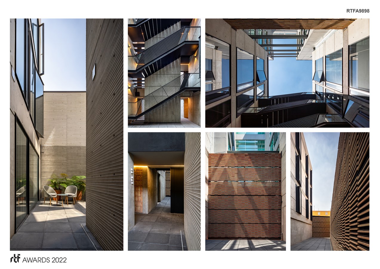 The material quality of ARX was a design premise. Apparent concrete with different finishes make up the building. Some smoothed with butt joints and others in the elevator shaft are planked and change color in different levels of the building. In the interior, smoothed cast-in-place concrete coexists with a local and handcrafted clay brick veneer.