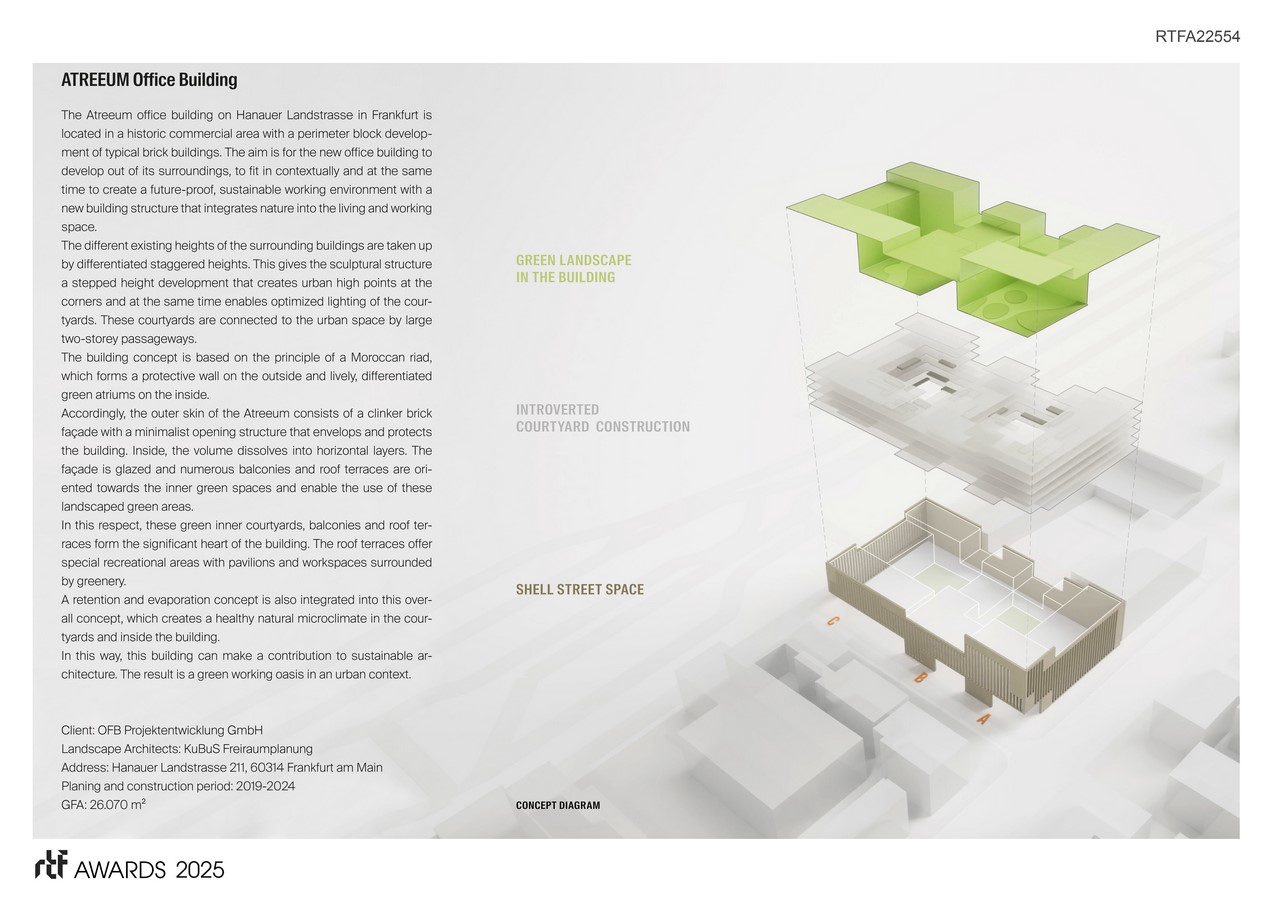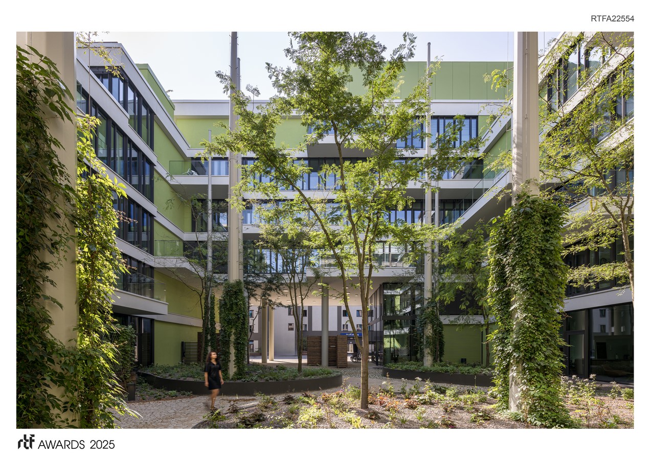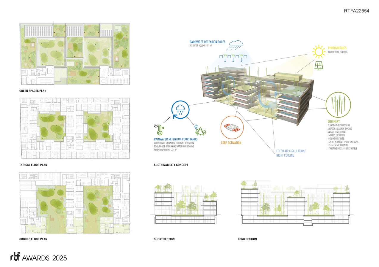 A retention and evaporation concept is also integrated into this overall concept, which creates a healthy natural microclimate in the courtyards and inside the building.