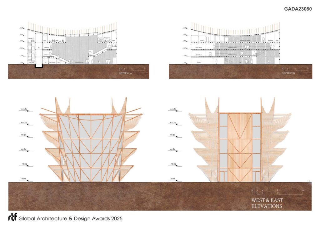 Its lightweight timber structure highlights both Bahraini craft and Japanese wood artistry, creating an immersive space that awakens the senses. Passive cooling through natural ventilation reduces energy use, reinforcing its commitment to sustainable design.