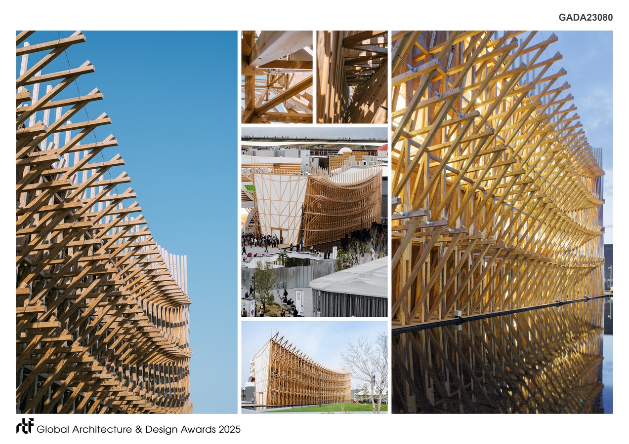 The Bahrain Pavilion at Expo 2025 Osaka is a testament to sustainability, cultural exchange, and craftsmanship. Inspired by Bahraini maritime heritage and Japanese carpentry, its open, dhow-like form evokes the vessels that once navigated Eastern Arabia and East Africa, symbolizing travel and interconnectedness. Constructed from around 3,000 pieces of unengineered wood using intricate joinery, it minimizes waste, requires no additional materials, and rests on minimal foundations to avoid concrete bedding, ensuring nearly all materials are reusable.