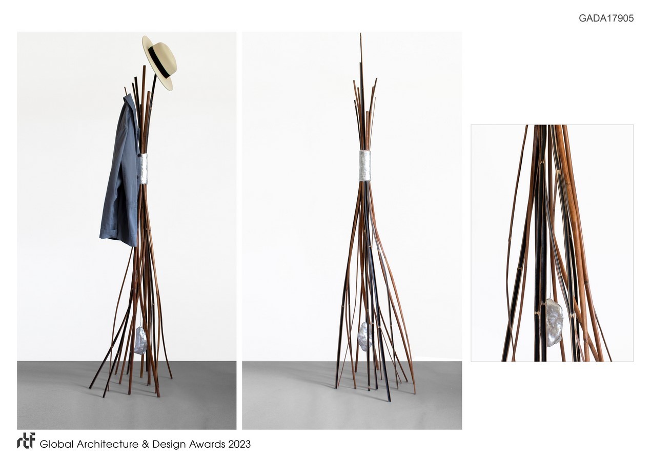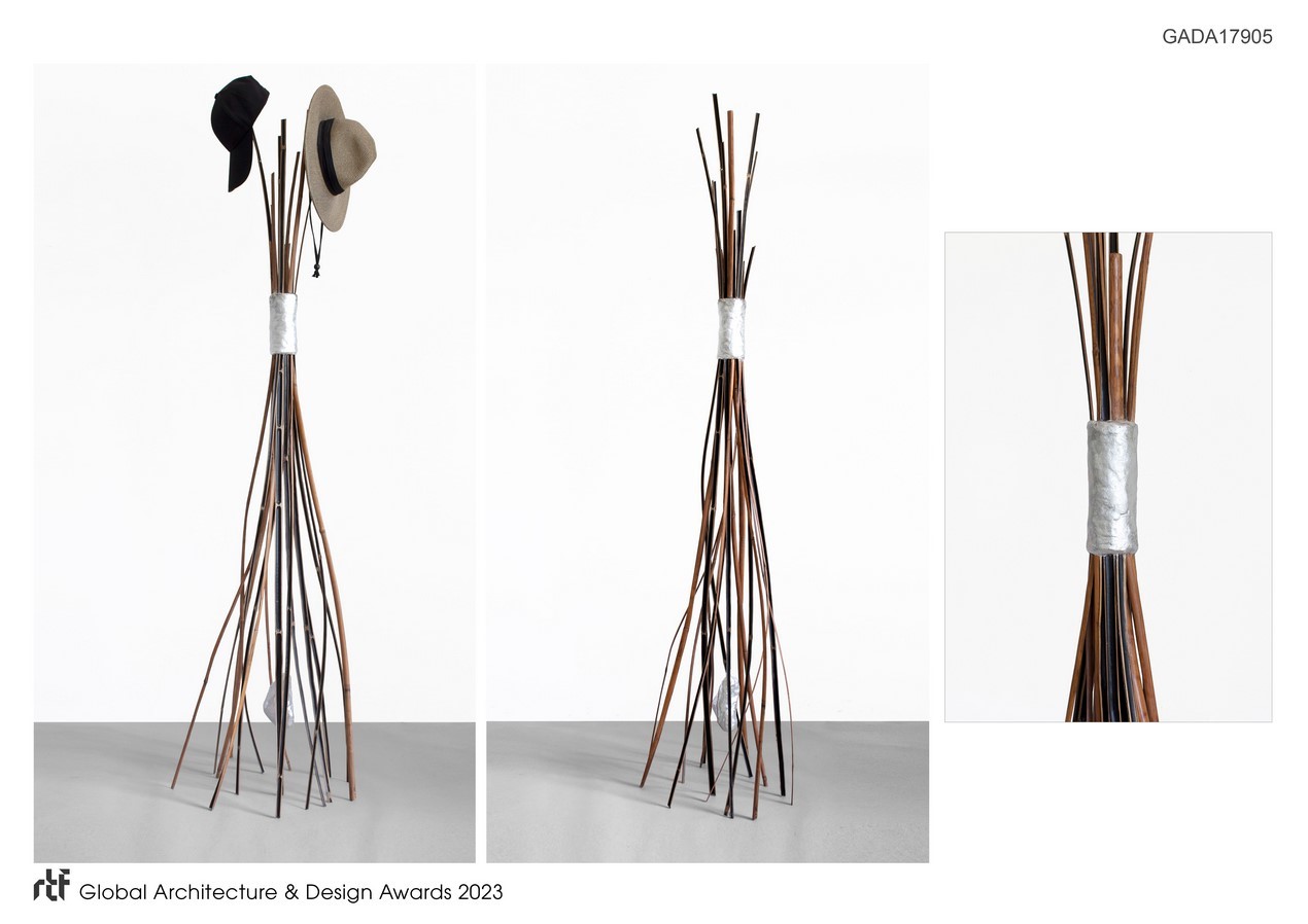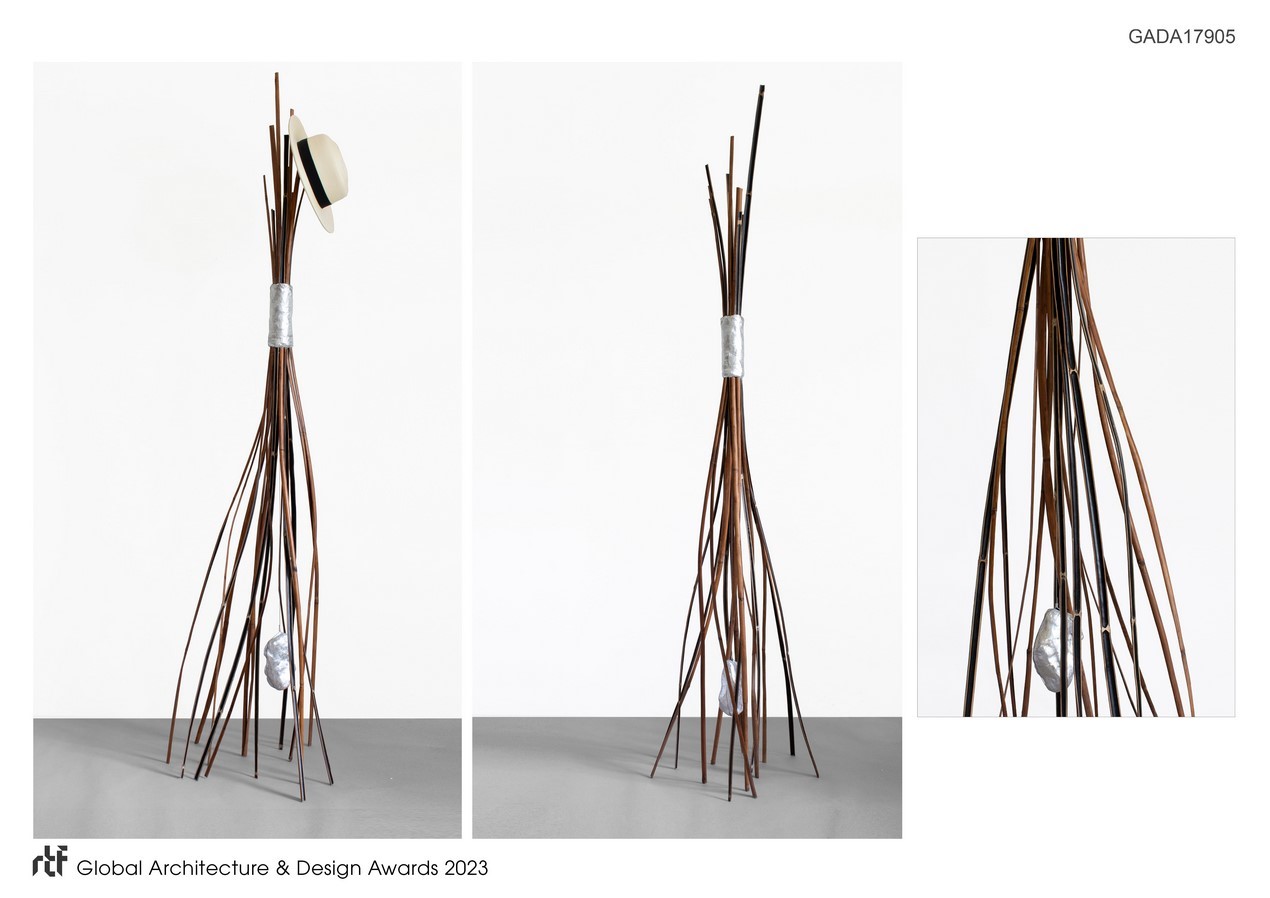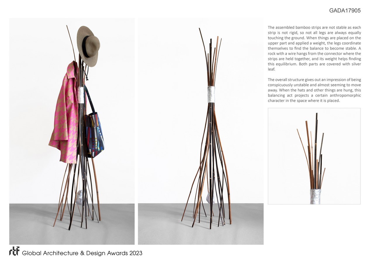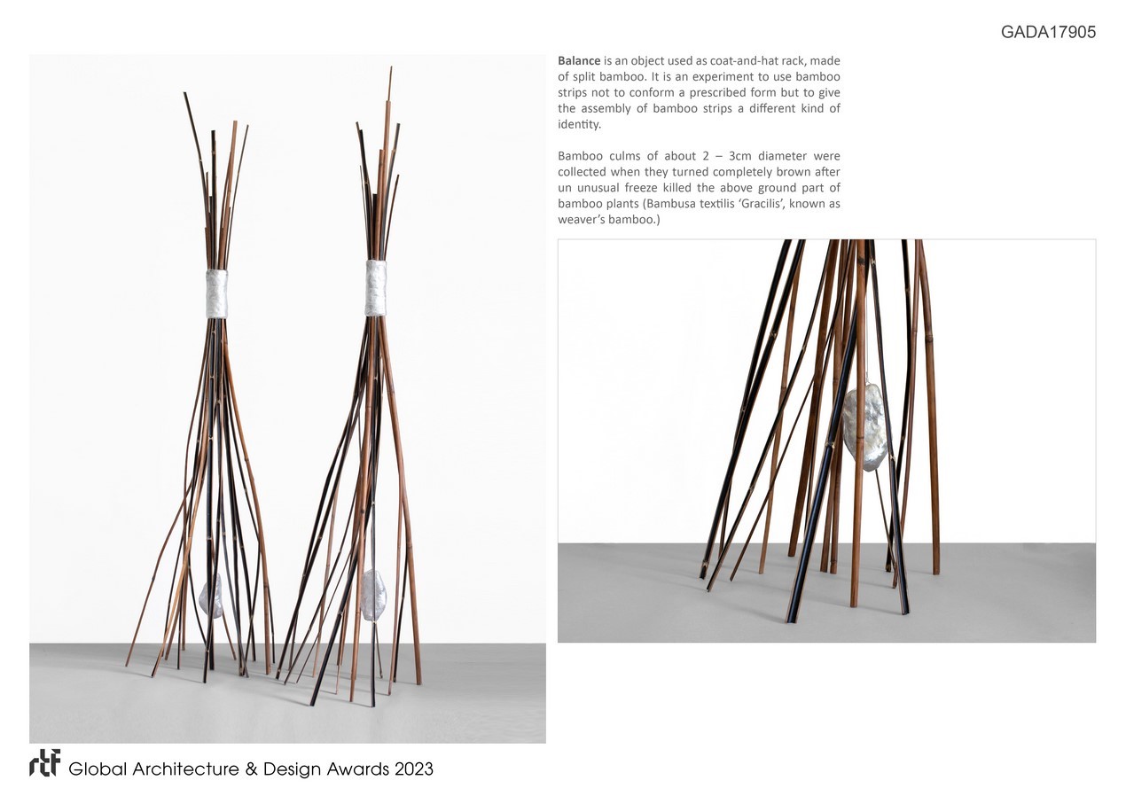 Balance is an object used as coat-and-hat rack, made of split bamboo. It is an experiment to use bamboo strips not to conform a prescribed form but to give the assembly of bamboo strips a different kind of identity.