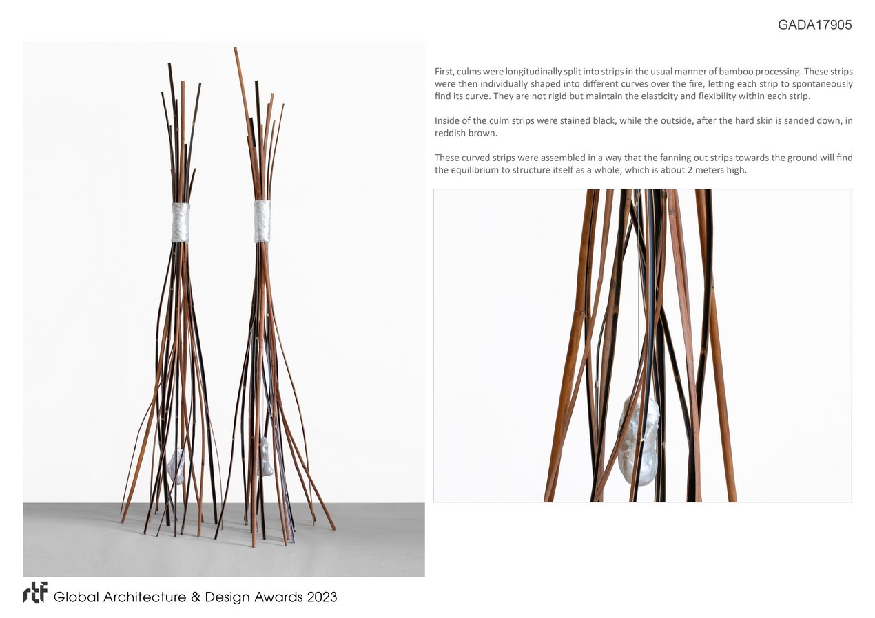 First, culms were longitudinally split into strips in the usual manner of bamboo processing. These strips were then individually shaped into different curves over the fire, letting each strip to spontaneously find its curve. They are not rigid but maintain the elasticity and flexibility within each strip.