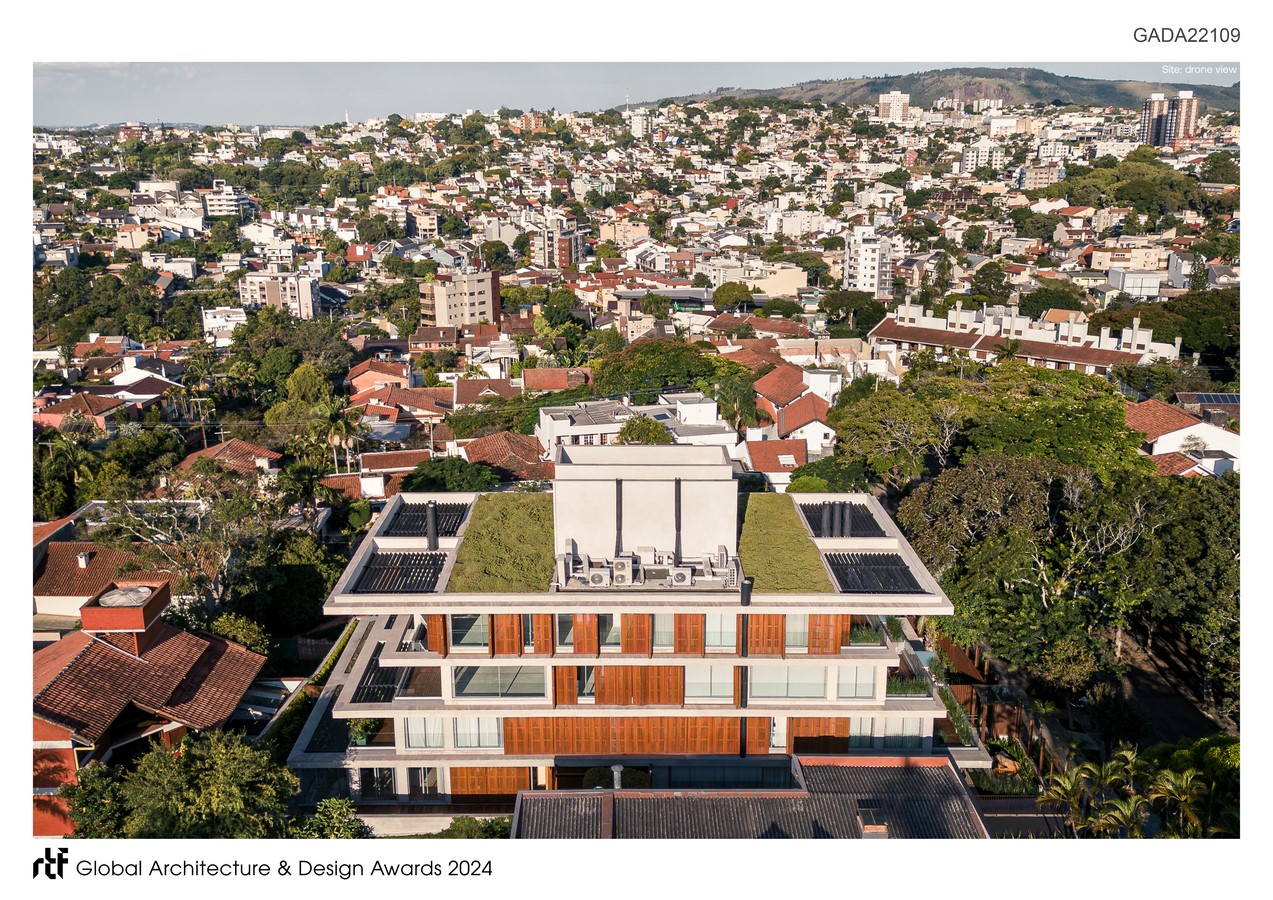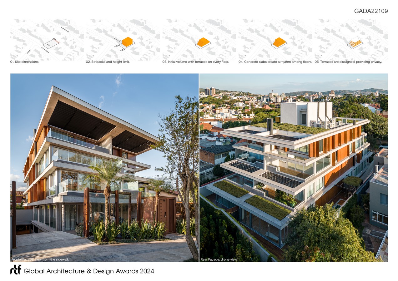 Its stepped volumetry reduces its impact on neighboring buildings, creating private terraces for the units. This design enhances the social activity within the city and adds value to the properties by increasing their private areas without fully utilizing the construction potential allowed by regulations.