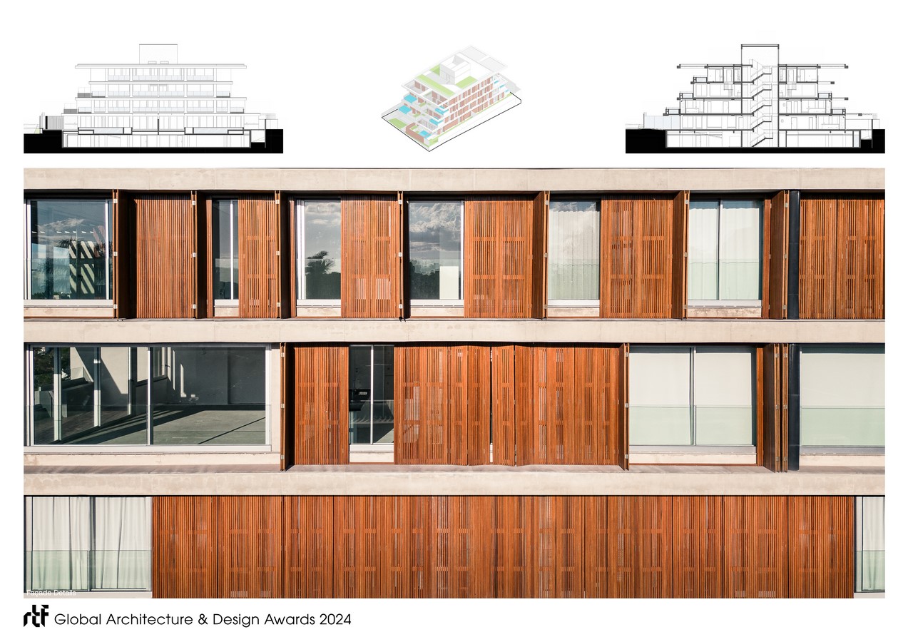 The building’s construction strategy is straightforward, with exposed concrete slabs creating distinct horizontal lines on the façades. Vertically, the volume features floor-to-ceiling windows and wooden slatted panels that can be opened or closed according to the residents’ preferences, ensuring flexibility in privacy and natural lighting.