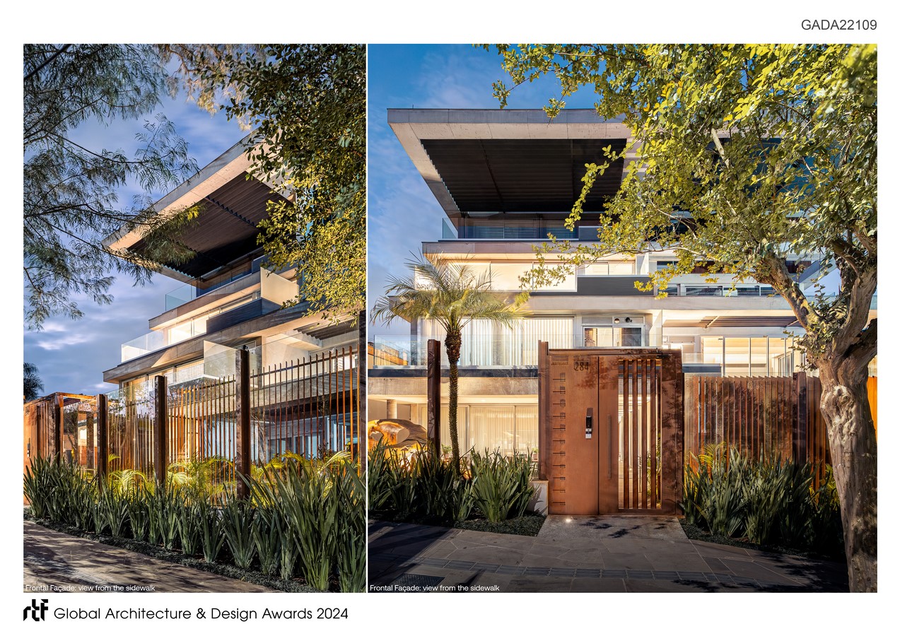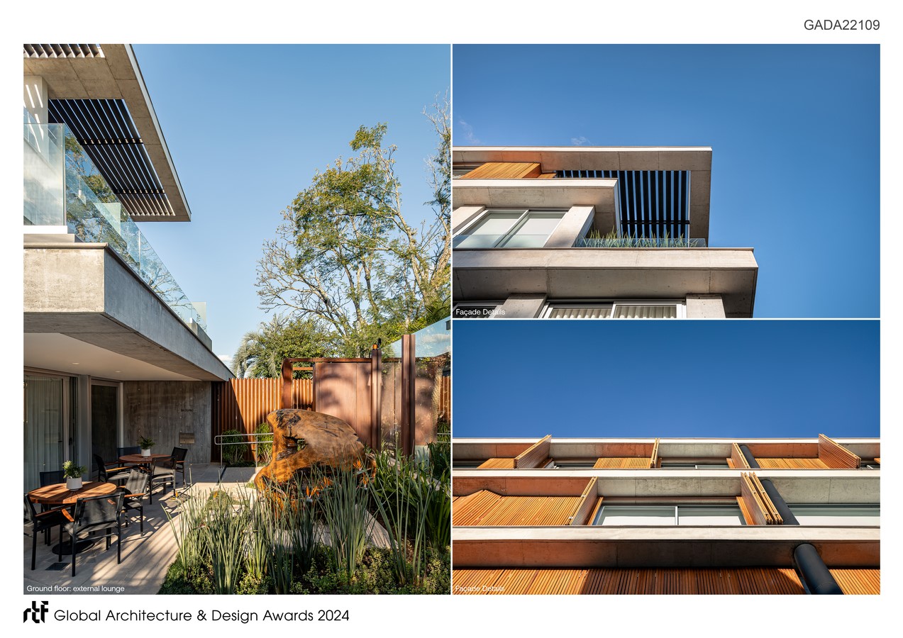 Adjacent to the entrance, there is a gourmet lounge that serves both casual and formal gatherings. Its generous openings and outdoor space provide views of the city, reinforcing the desire to connect internal and external spaces, private and public.
