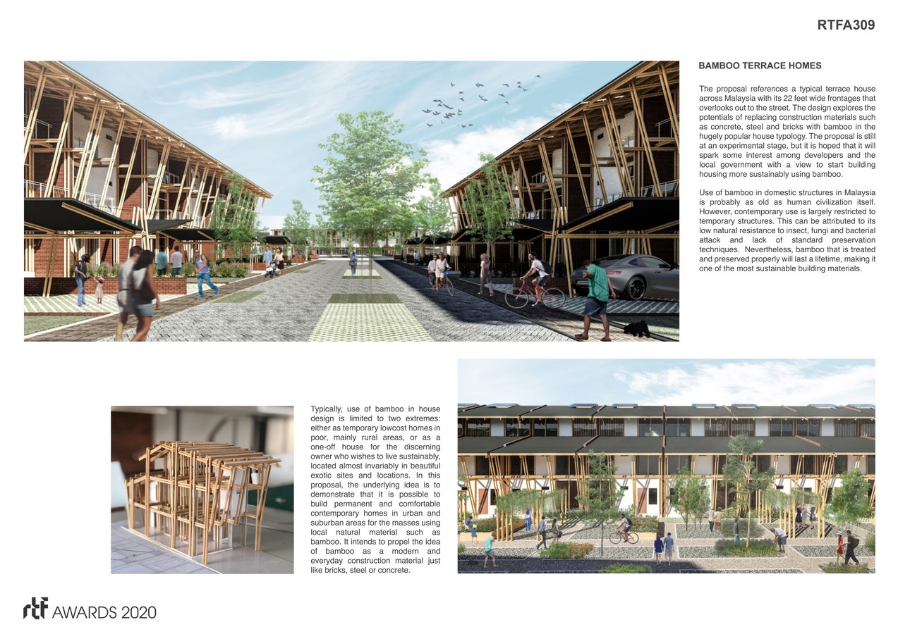 The proposal references a typical terrace house across Malaysia with its 22 feet wide frontages that overlook out to the street. The design explores the potentials of replacing construction materials such as concrete, steel, and bricks with bamboo in the hugely popular house typology. The proposal is still at an experimental stage, but it is hoped that it will spark some interest among developers and the local government with a view to starting building housing more sustainably using bamboo.