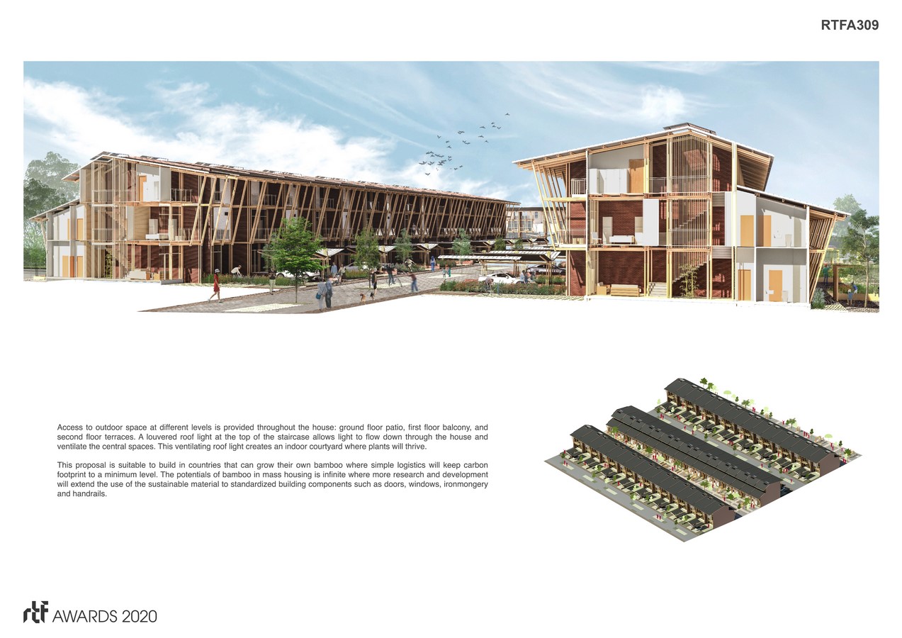 The underlying idea of this proposal is to demonstrate that it is possible to build permanent and comfortable contemporary homes in urban and suburban areas for the masses using local natural materials such as bamboo. It intends to propel the idea of bamboo as a modern and everyday construction material just like bricks, steel or concrete.   Bamboo grows very quickly where culms suitable for structures can be harvested within 3 years of cultivation. It is a remarkably strong material for building structures, and this is convincingly demonstrated by looking at ‘informal structures’ such as scaffolding for tall buildings in Hong Kong and large vernacular edifices in Indonesia and Vietnam and bridges in parts of rural Southeast Asia.