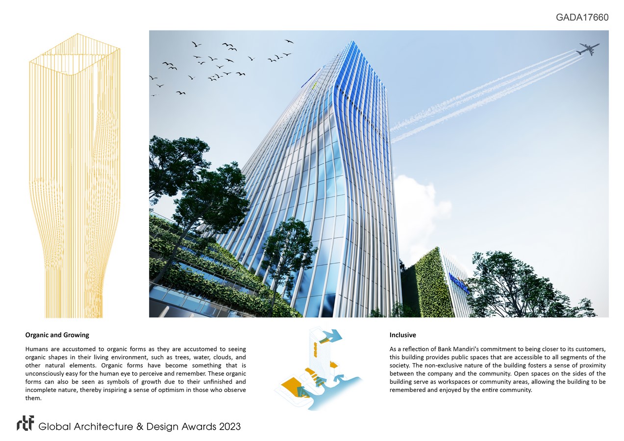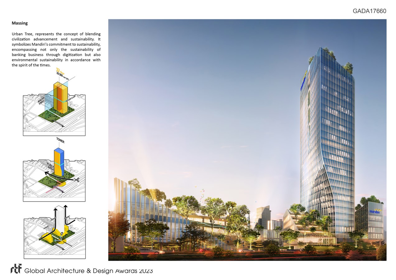 Similarly, the design of this building is expected to be easily comprehensible by the community that observes it, and to remember this building as a symbol of Bank Mandiri’s progress optimism, much like a tree that will continuously grow, develop, and bear fruit.