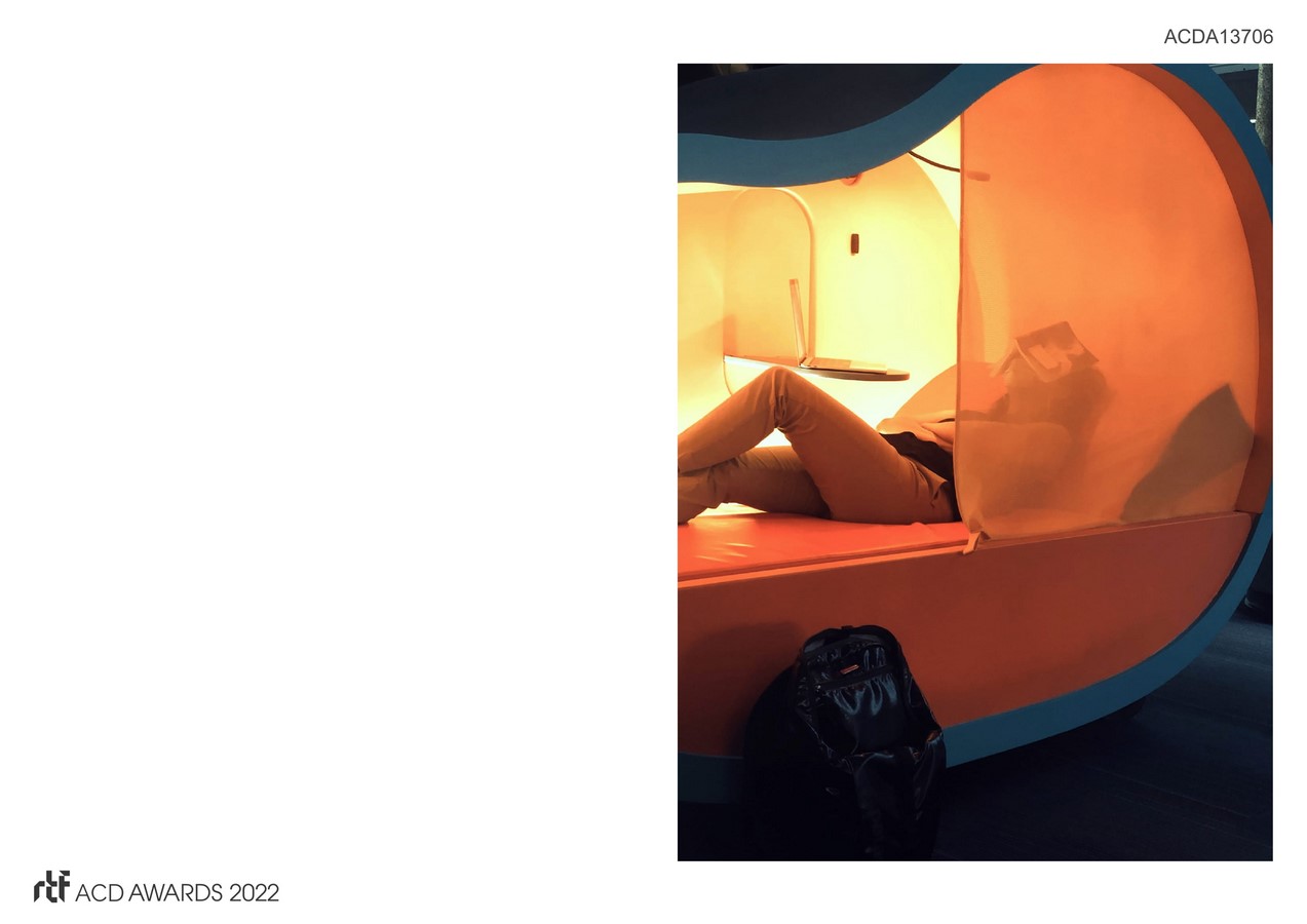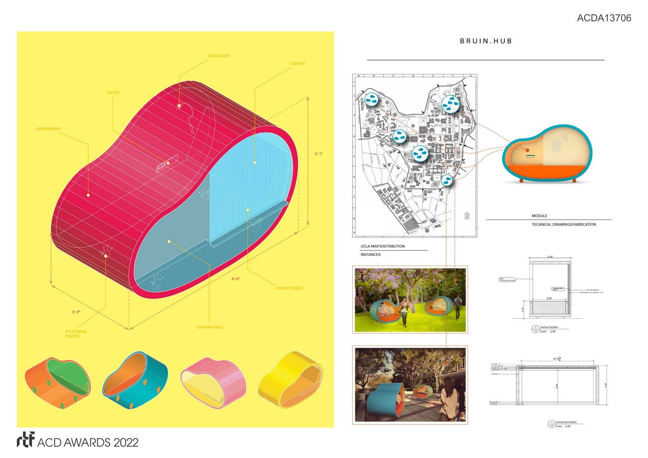 The hub is accessible 24/7 with spaces for both focus and collaborative work, as well as continuous access to basic amenities such as Wi-Fi, cafe-style workstations, bathrooms, showers, a kitchenette, and a personal storage area. The key feature of the BruinHub is the BEANS. The pods are prefabricated units consisting of a CNC-cut plywood frame finished with vinyl upholstery. Conceived as a micro-environment, each BEAN is equipped with ambient lighting, an adjustable reading lamp, a power outlet for personal devices, a movable privacy screen, and a flexible upholstered interior that can be easily modified from “work” to “sleep” mode. The BEAN was designed with the aim of maximizing ergonomic comfort and efficiency while minimizing size, weight, and cost of each unit. The five color schemes are intended to create a vibrant and cohesive environment in the hub while leaving room for individual preferences and even modifications.