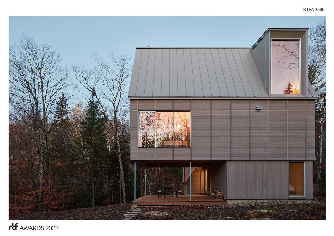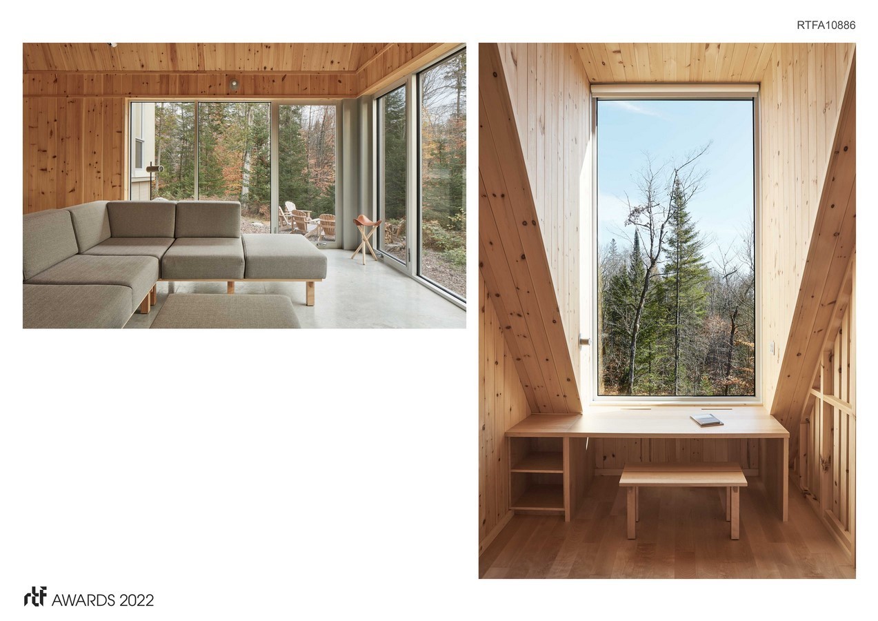 The challenge to surmount was steep: to offer an architecture that would seem familiar, as if it had always been concealed within the landscape – but which, at the same time, would have a novel dimension, of something unexpected and contemporary. This guiding line is reflected across each scale of the project, through bold volumes and the use of materials mostly in their raw state, without paint or artifice. Durability being essential, the outer coating of preaged cedar and the galvanized steel sloping roof ensure uniform aging, communicating the passage of time. Inside, the pine slats and the heated concrete floor lend a warm aspect to the space.