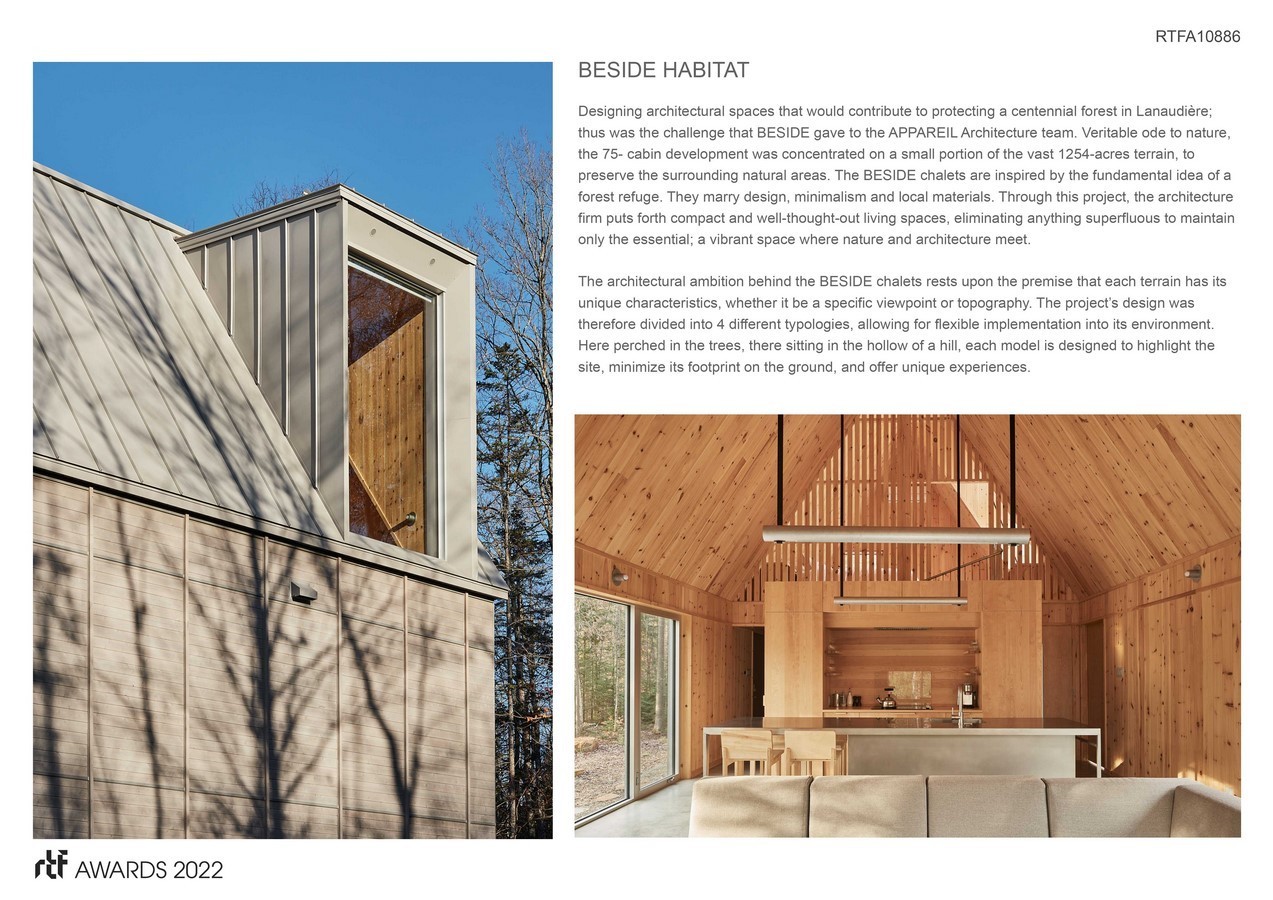 BESIDE HABITAT – Designing architectural spaces that would contribute to protecting a centennial forest in Lanaudière; thus was the challenge that BESIDE gave to the APPAREIL Architecture team. Veritable ode to nature, the 75- cabin development was concentrated on a small portion of the vast 1254-acres terrain, to preserve the surrounding natural areas. The BESIDE chalets are inspired by the fundamental idea of a forest refuge. They marry design, minimalism and local materials. Through this project, the architecture firm puts forth compact and well-thought-out living spaces, eliminating anything superfluous to maintain only the essential; a vibrant space where nature and architecture meet.