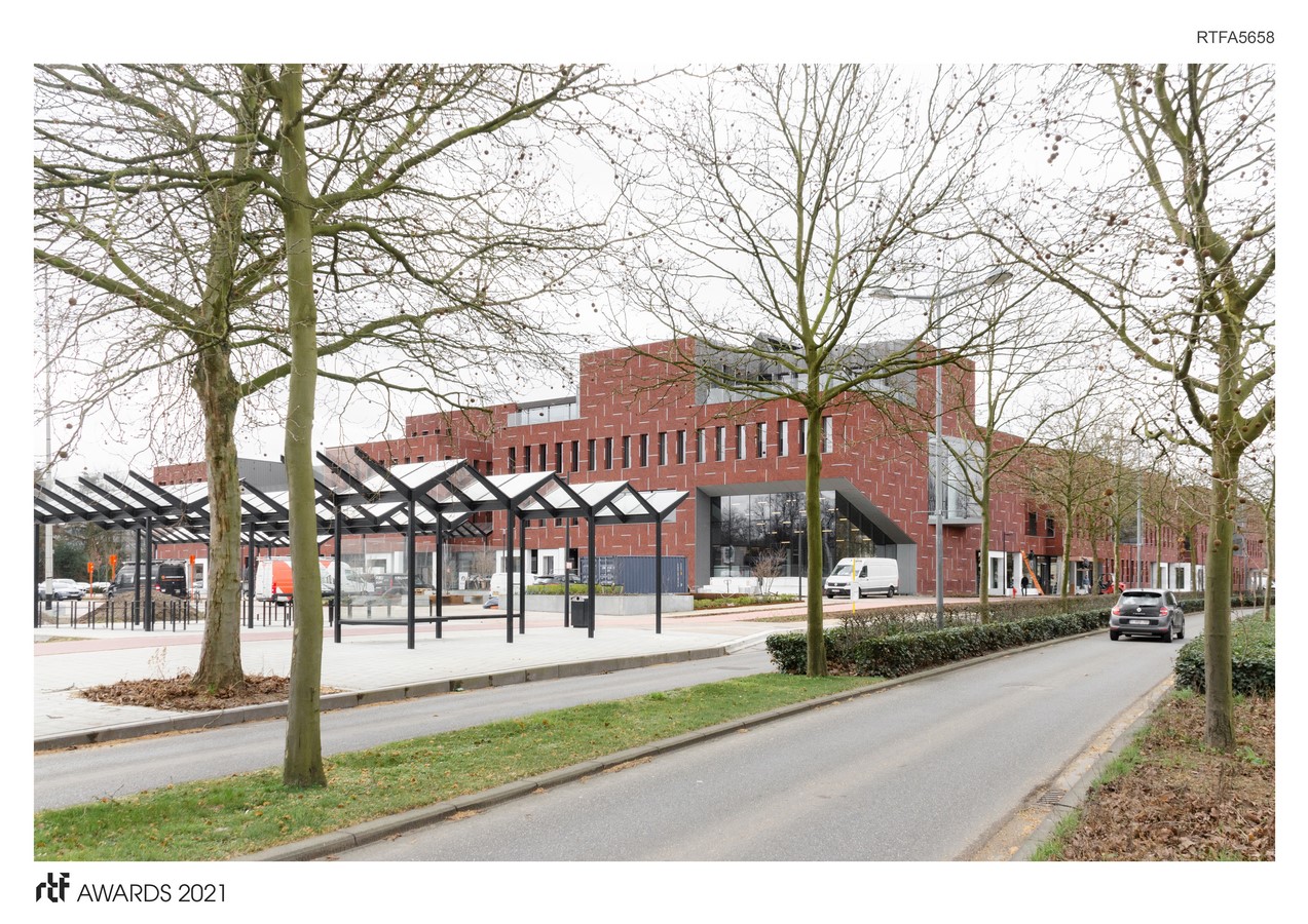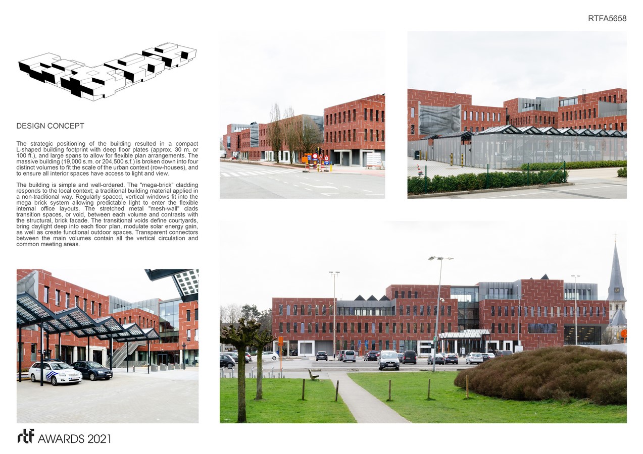 The Beveren Civic Center is located on the central artery in the heart of the City of Beveren, twenty minutes west of Antwerp. The project is the new central municipal administration building containing all city hall departments, public service administration, and the police headquarters.
