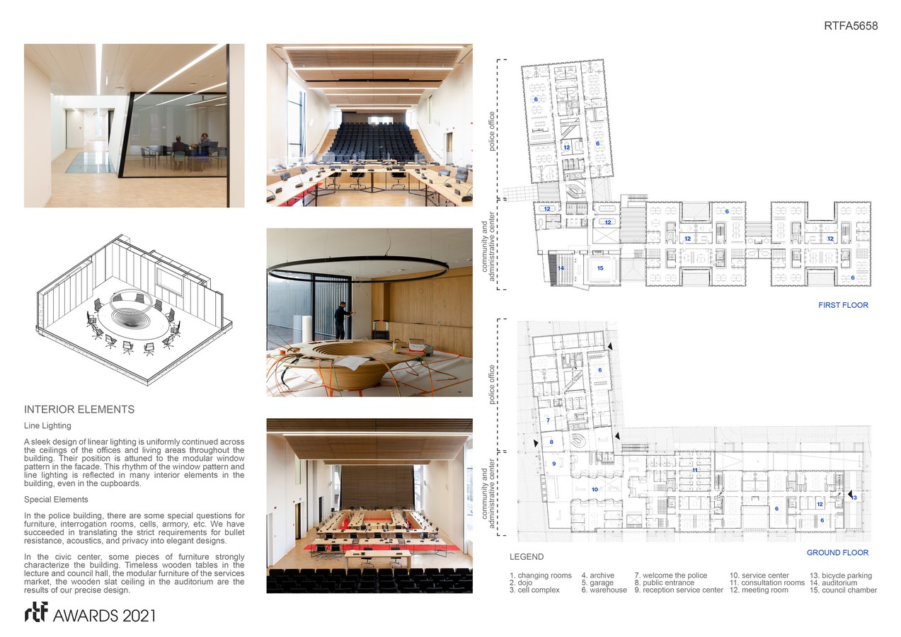 The police station and city hall departments are each housed on one leg of an L-shaped building. At the junction of both is an entry volume, which contains the representative functions of the civic center: assembly hall, public auditorium, and public “service market”. The entry façade opens onto and helps define a new civic square.