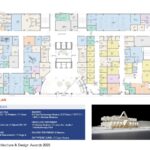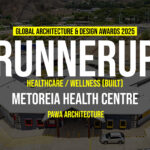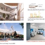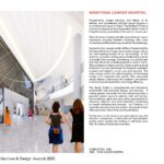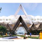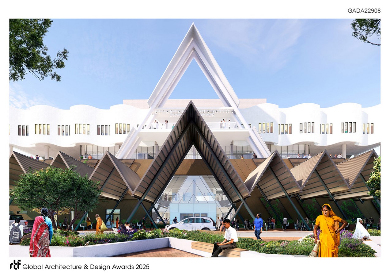 Architecturally, the building draws inspiration from the Himalayan landscape. A series of arcades lead to a central peak, mirroring the ascent of Mount Everest. Patient rooms, designed to float above the building’s base, offer panoramic views of the surrounding plains. A rooftop garden connected to the cafeteria provides a peaceful space for rest and reflection. Natural light and views to the exterior throughout the hospital support healing and well-being.