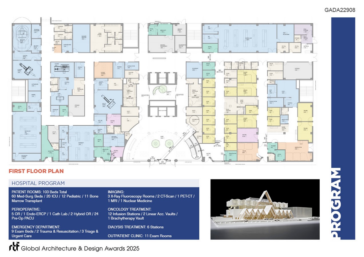 Architecturally, the building draws inspiration from the Himalayan landscape. A series of arcades lead to a central peak, mirroring the ascent of Mount Everest. Patient rooms, designed to float above the building’s base, offer panoramic views of the surrounding plains. A rooftop garden connected to the cafeteria provides a peaceful space for rest and reflection. Natural light and views to the exterior throughout the hospital support healing and well-being.