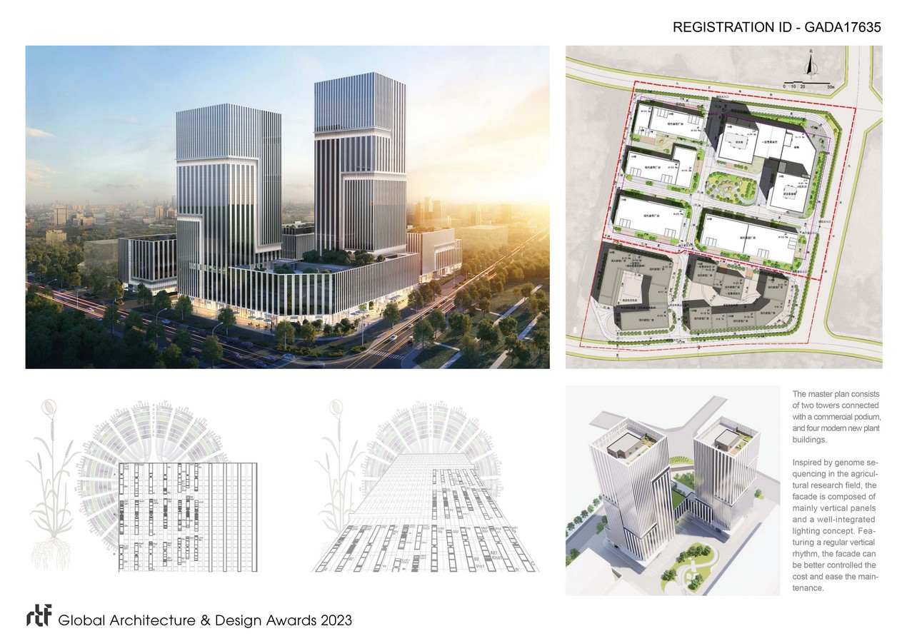 Inspired by genome sequencing in the agricultural research field, the facade is composed of mainly vertical panels and a well-integrated lighting concept. Featuring a regular façade rhythm, the size of glass and aluminum panels can be standardized to be better controlled the cost and eased the façade maintenance.