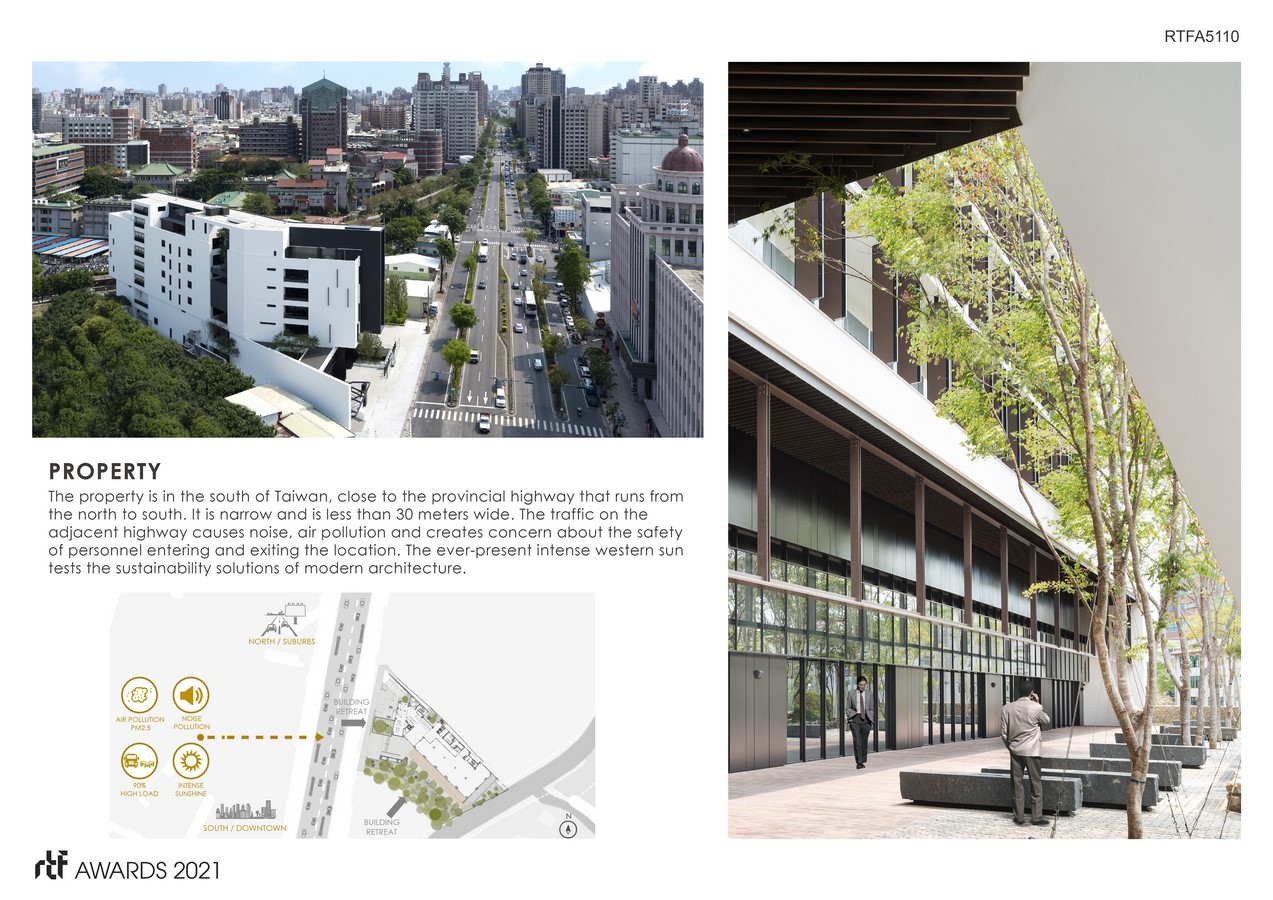 The project is located in the south and close to the north-south provincial highway in Taiwan. The narrow plot is less than 30 meters wide so space constraints are something that had to be accounted for. The site is hampered by noise from the provincial highway, air pollution, and concerns about employees and guests transiting to the office.