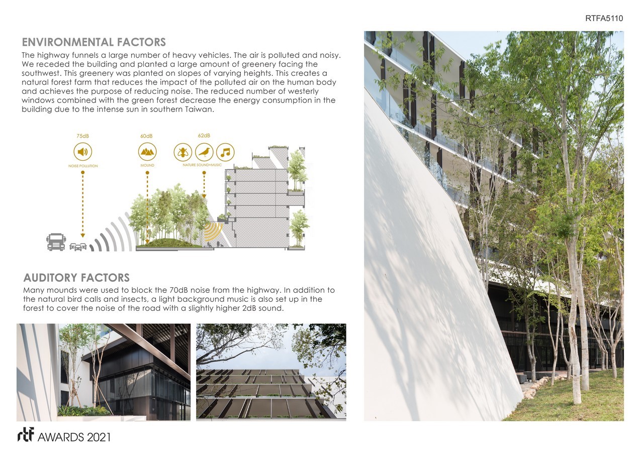 Taiwan is in a subtropical environment. This means high humidity which effects the maintenance of building and all the objects inside of it. The exterior of the building is changed from waterproof tiling to a waterproof coating, which makes the exterior 2500x more hydrophobic while still allowing oxygen into and out of the building. This also solves the problem of unclean water coating the outside of a project creating a living building that breathes. The corridor of the entrance is surrounded by a high degree of natural sloping embankments and densely planted trees. The exterior is dotted with stone chairs. This creates a natural forest farm that reduces the impact of the polluted air on the human body and achieves the purpose of reducing noise.