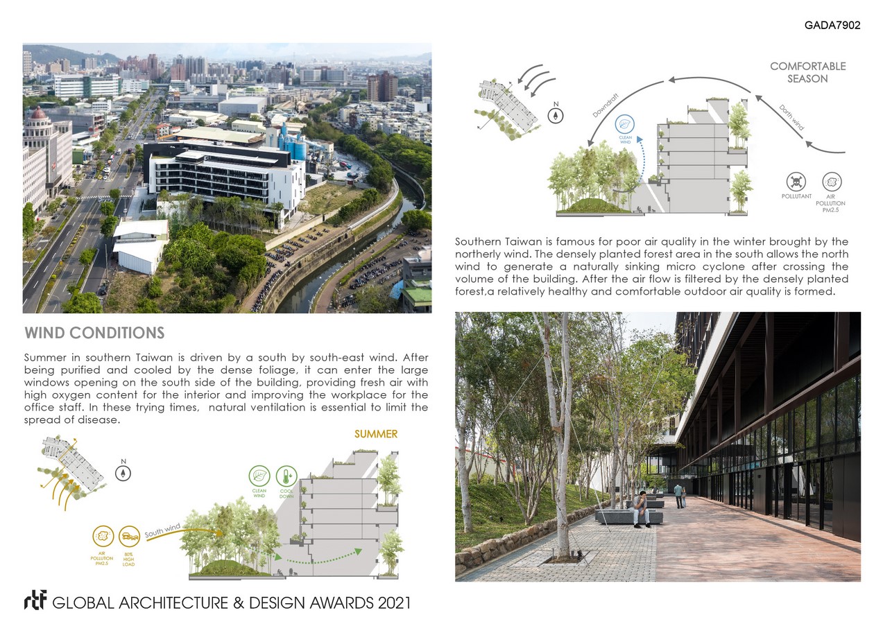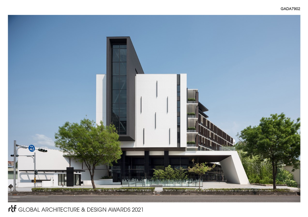 The project is located in the south and close to the north-south provincial highway in Taiwan. The narrow plot is less than 30 meters wide so space constraints are something that had to be accounted for. The site is hampered by noise from the provincial highway, air pollution, and concerns about employees and guests transiting to the office.