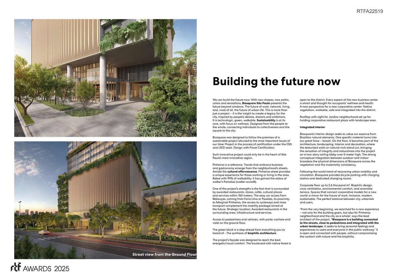 “From the very beginning, we searched for a new experience – not only for the building goers, but also for Pinheiros neighborhood and the city as a whole”, says the lead architect of the project. “Biosquare is a building connected to the streets, close to pedestrians and integrated with the urban landscape. It seeks to bring sensorial feelings and experiences to users and everyone in the public walkway.” It is open and connected with people, without compromising the contact with nature and the biophilia.