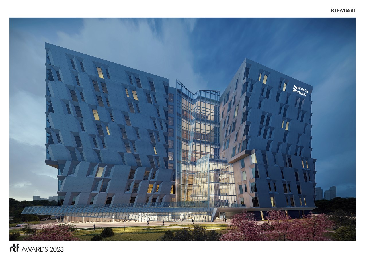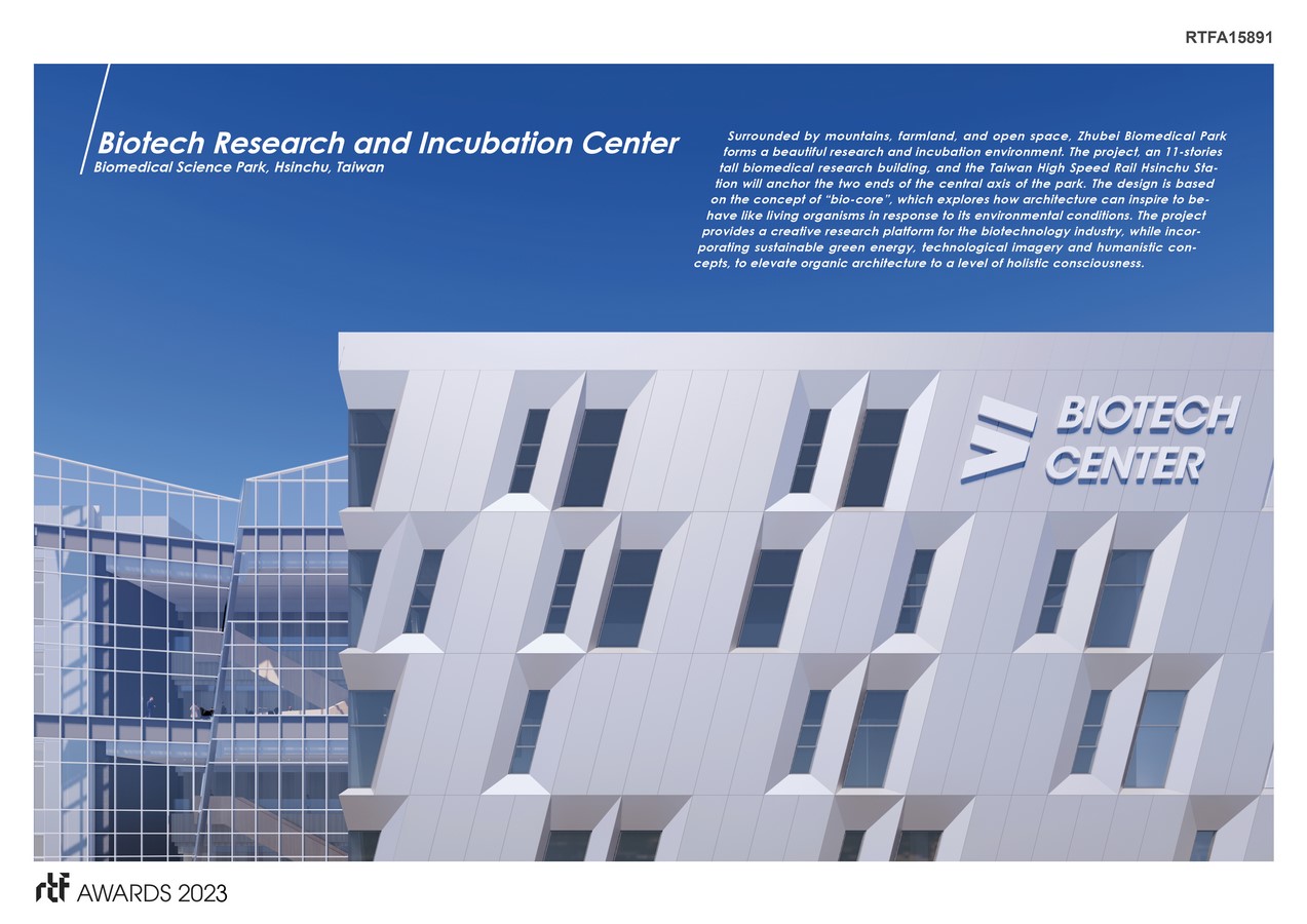 Surrounded by mountains, farmland, and open space, Zhubei Biomedical Park forms a beautiful research and incubation environment. The project, an 11 stories tall biomedical research building, will serve as the flagship building of the park and will anchor the eastern end of the park, while the Taiwan High Speed Rail Hsinchu Station will anchor the other end of the central axis. The design is based on the concept of ” bio-core “, which explores how architecture can inspire to behave like living organisms in response to its environmental conditions.