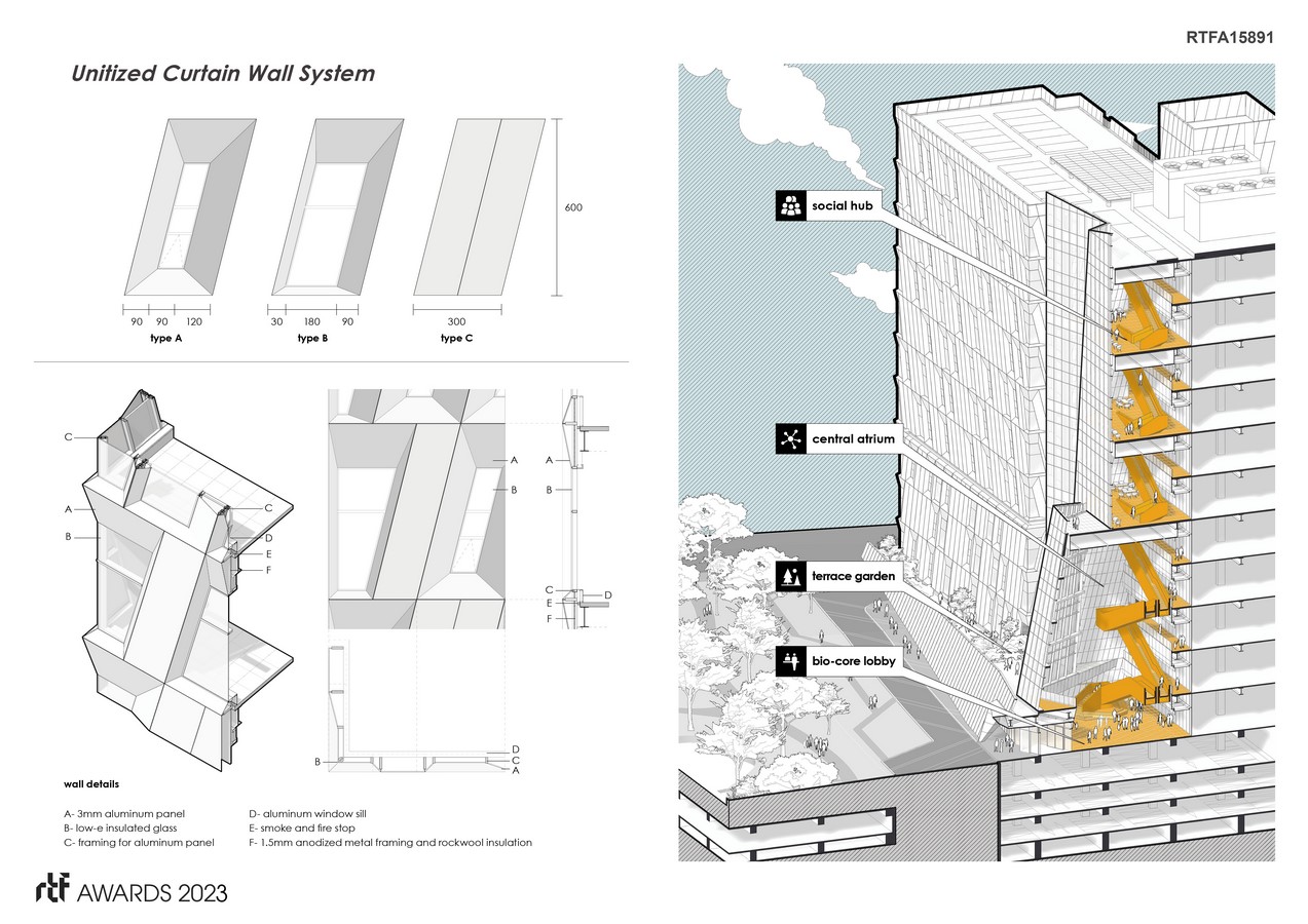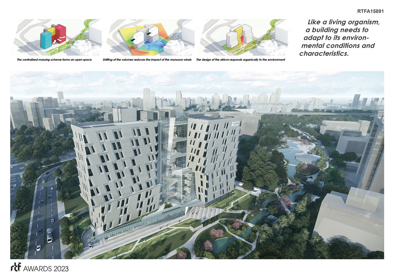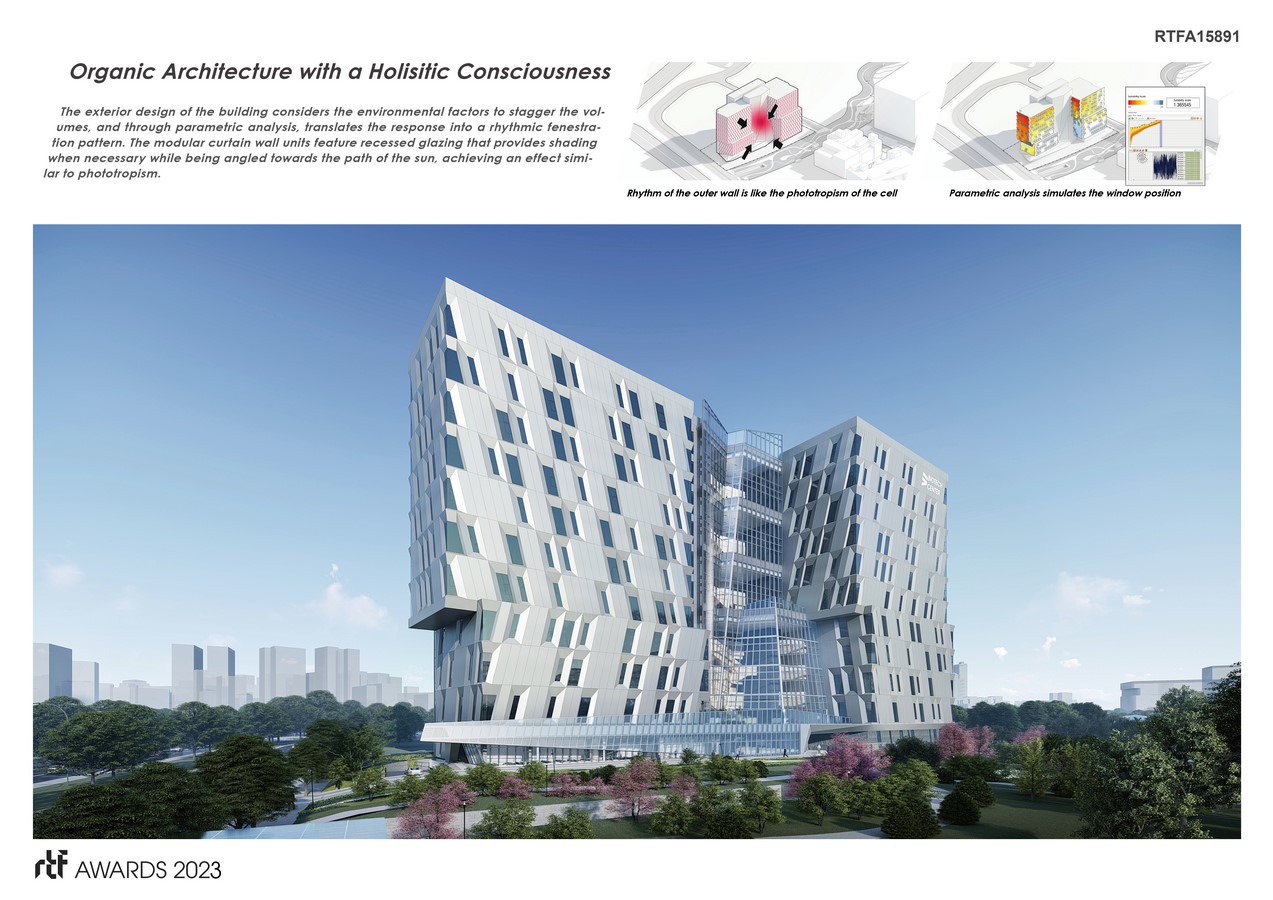 In terms of site planning, the concentration of the building volumes allows for maximum open space and facilitates connection with the central green belt. The exterior design of the building considers the environmental factors to stagger the volumes to enhance shading and ventilation, and through parametric daylighting analysis, translates the response into a rhythmic fenestration pattern. The modular curtain wall units feature recessed glazing that provides shading when necessary while being angled towards the path of the sun, achieving an effect similar to phototropism. A total of three typical unit types is sufficient to produce the complex architectural expression, thereby saving cost and reducing the use of resources. The overall effect is both organic in spirit and dynamic in form.
