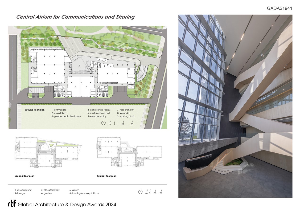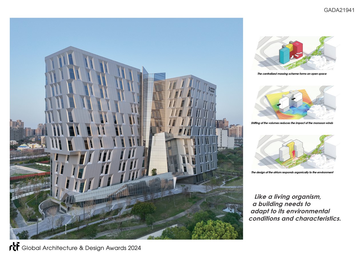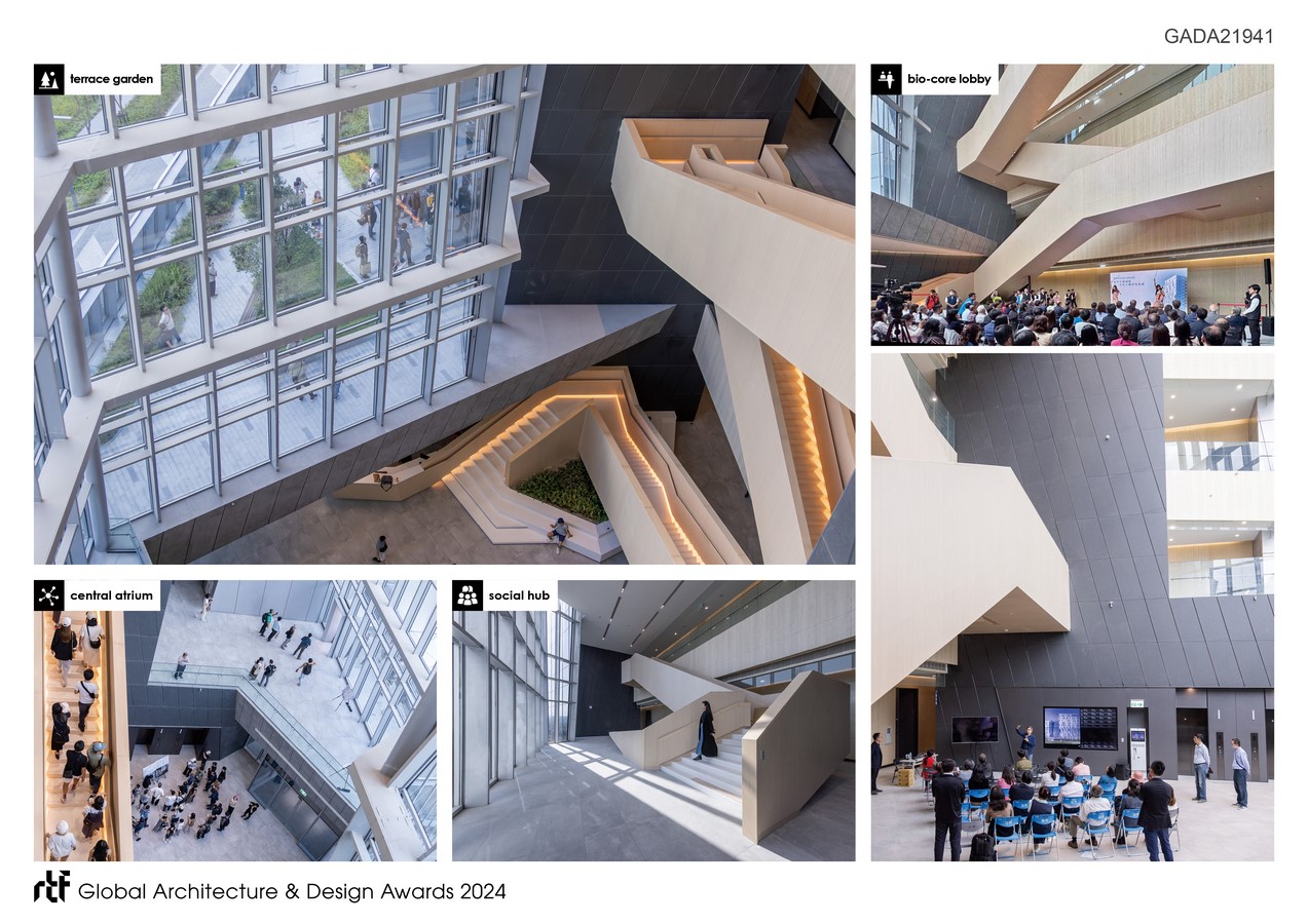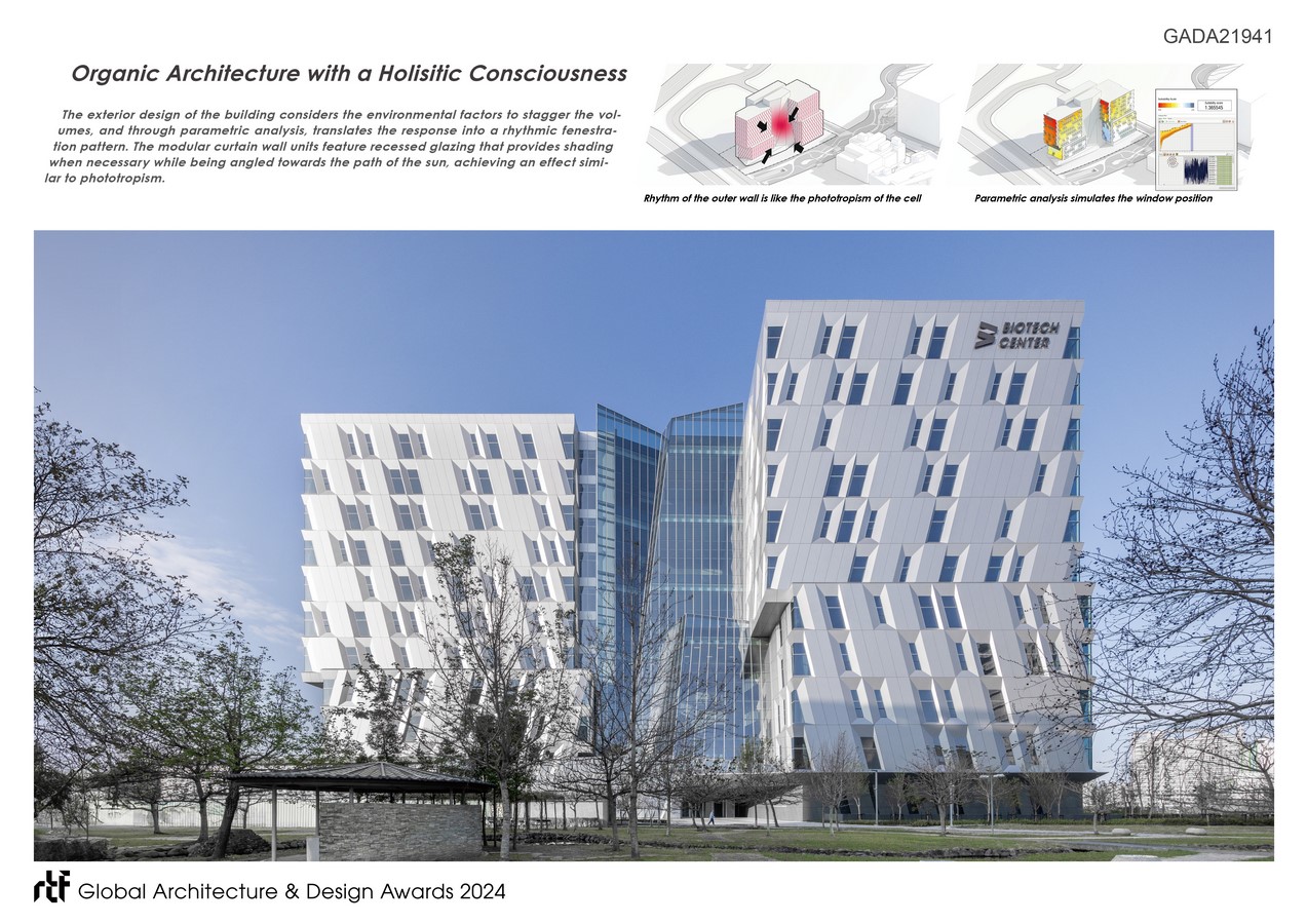 The center phase III with a total of three typical unit types, serve as the flagship building of the Biomedical Science Park. In terms of site planning, the concentration of the building volumes allows for maximum open space and facilitates connection with the central green belt.