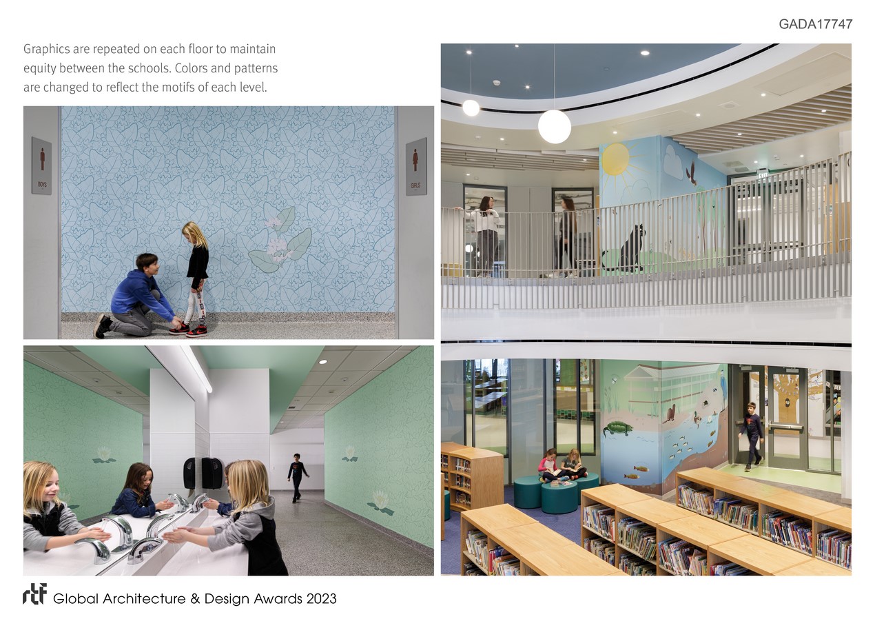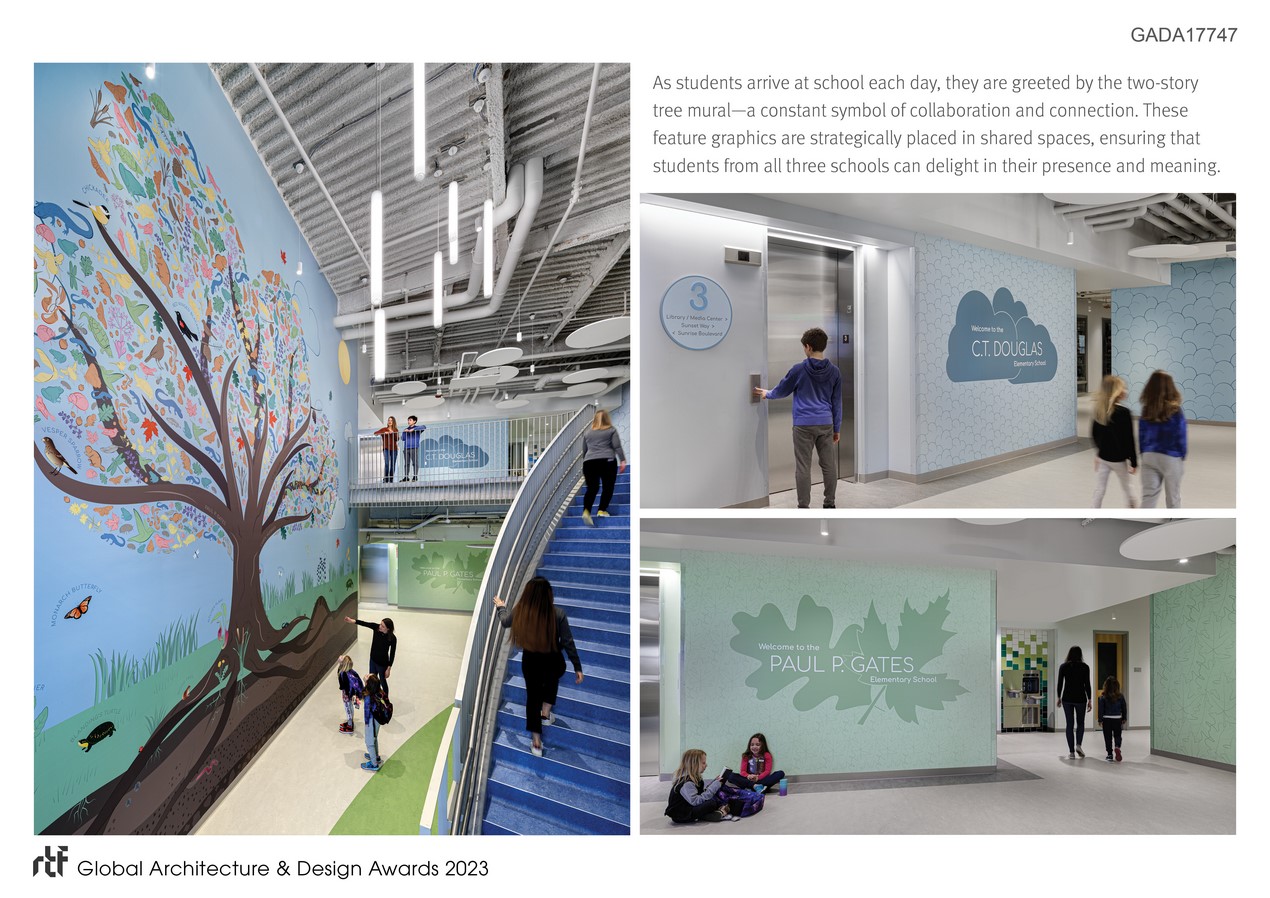 The site’s natural landscape and adjacency to a protected wetland inspired the design of educational graphics, wayfinding, and signage. Themes and colors from nature defined how each school would be graphically identified throughout the building’s three levels: earth with warm yellows for the first level Huebner preschool, green treetops for the second level Gates Elementary, and blue sky for the upper-level Douglas Elementary. This approach connects the three schools while still providing each with their own personality.