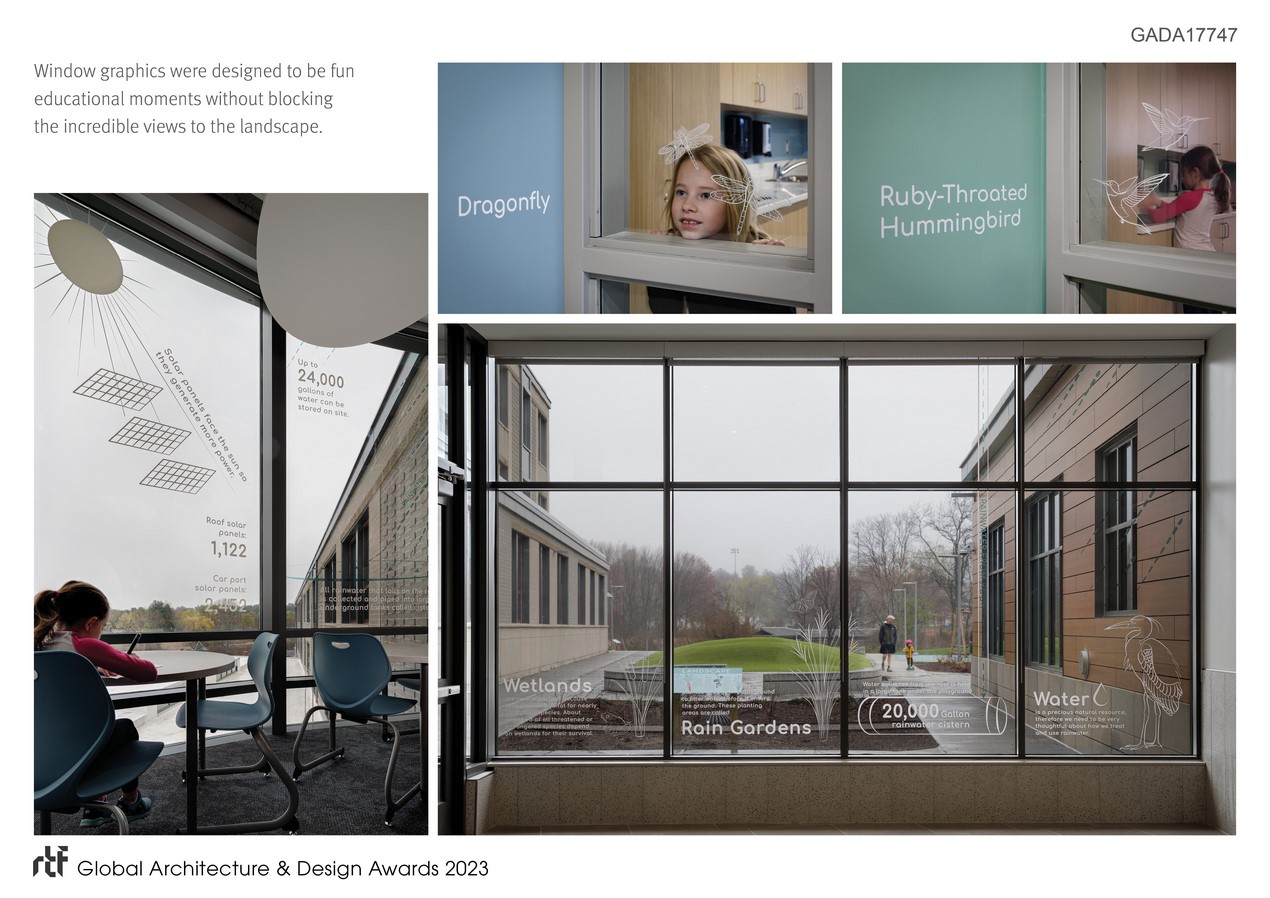 Collaborations with consultants and curriculum leaders informed the content of educational, grade-appropriate installations showcasing the building’s sustainability features. These installations occur in the landscape, throughout the Learning Commons and extend to a three-story curved window wall that tells the story of how water is used within the building. The intentional placement of these window graphics allows students to read relevant information while looking out to the location of the features. Beginning on the third floor, students see rainwater being collected on the roof. It then flows to the second level, illustrating how water is stored and used within the building. Finally, at the ground level, students see a 20,000-gallon cistern installed under the playground.