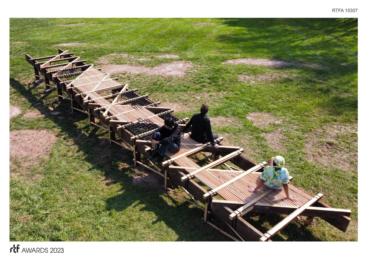 Constructed entirely out of reclaimed lumber dating back more than one hundred years, BoardWalk is a project that aims to consider the past, present, and future lifecycles of its materials. Designed as part of the 2022 Bethel Woods Art and Architecture Festival, the project is a multifunctional destination serving as an informal gathering space, temporary stage, and viewing platform while overlooking the historic grounds of the 1969 Woodstock Music Festival. Composed of only recycled nylon strapping and reclaimed wood members, the 40-foot-long installation uses no glues, adhesives, or mechanical fasteners with the intention that the structure can be disassembled, moved, and reused over and over again with ease.