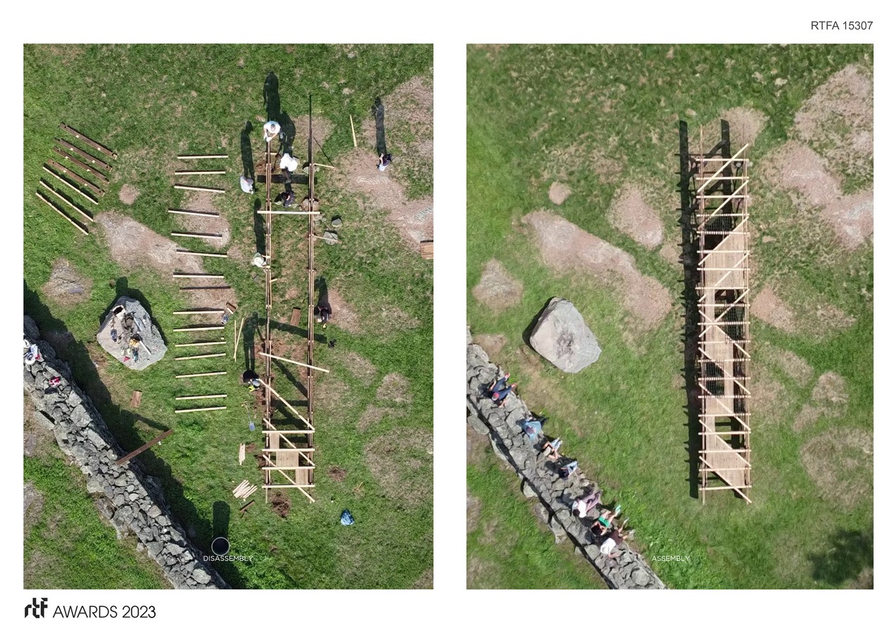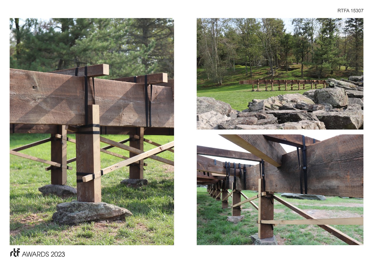 Once onsite a series of reversible nylon strapping connections are used to further stabilize critical connection points throughout the project while simultaneously offering hammock-like surfaces as playful moments designed for leisure throughout the project. The result is a seemingly floating compilation of materials that appears delicate in assembly yet massive in scale. Newly processed areas of each element juxtapose the old aging surface characteristics of the eastern hemlock wood based on one’s orientation bringing into question whether the project is something new or still a relic of the past.