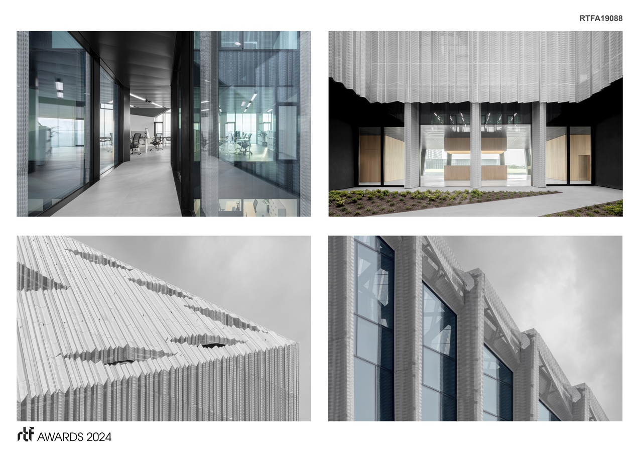 The cornerstone of the design was to incorporate the courtyard typology into the building. This courtyard houses a green garden on the ground floor and enhances natural ventilation through a chimney effect. In response to local sunlight conditions, the building’s roof has been tilted, enlarging the north facade to maximize workspace with indirect natural light while reducing the south facade to improve indoor comfort. It’s almost a celebration of indirect northern light, articulated through the building’s geometry. The south-facing facades and roof of the headquarters are clad in a second skin made from a custom continuous aluminum mesh, which filters intense light and ensures a comfortable indoor environment.