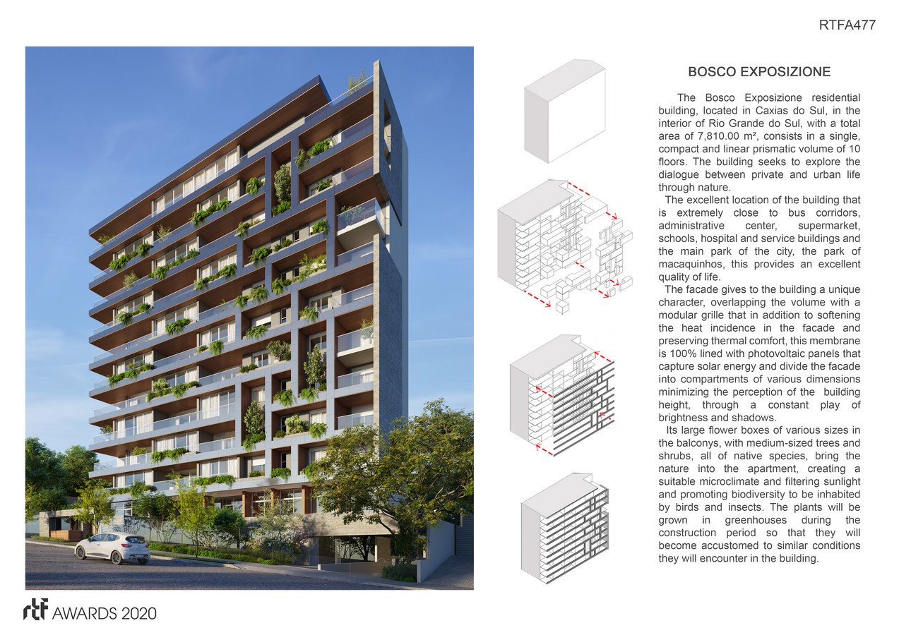 The Bosco Exposizione residential building, located in Caxias do Sul, in the interior of Rio Grande do Sul, with a total area of 7,810.00 m², consists of a single, compact and linear prismatic volume of 10 floors. The building seeks to explore the dialogue between private and urban life through nature.