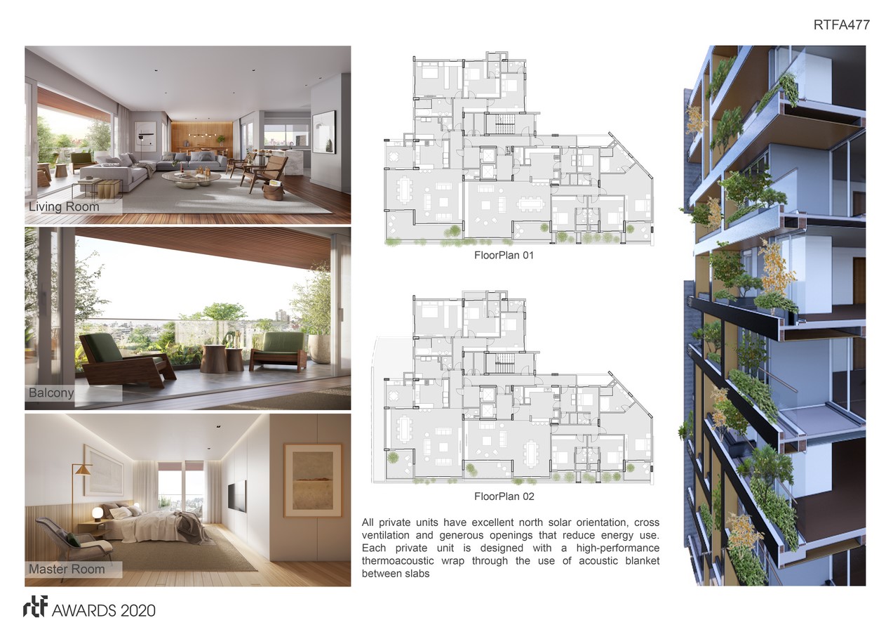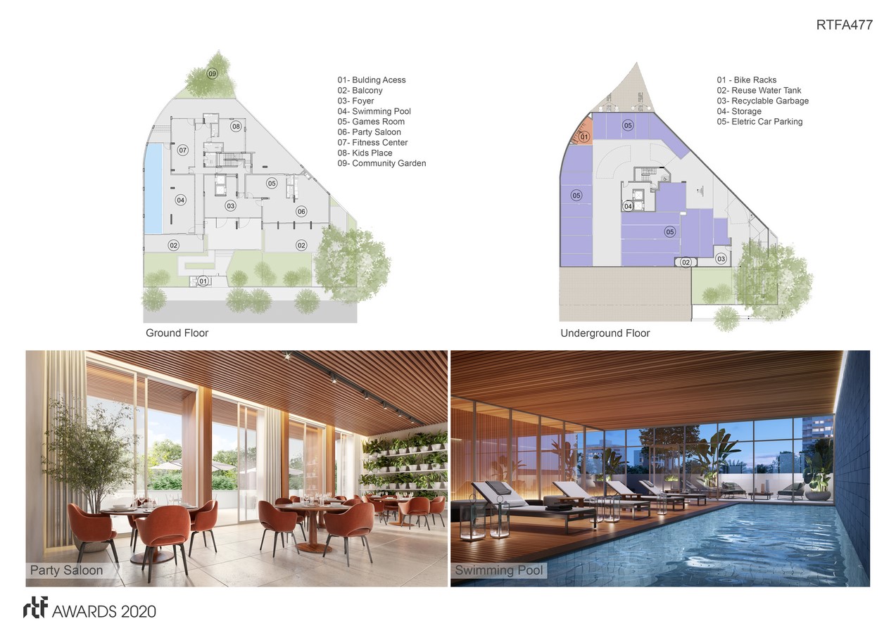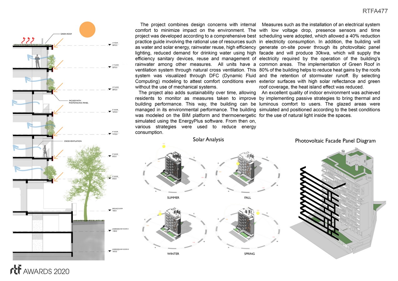 The project combines design concerns with internal comfort to minimize the impact on the environment. The project was developed according to a comprehensive best practice guide involving the rational use of resources such as water and solar energy, rainwater reuse, high-efficiency lighting, reduced demand for drinking water using high-efficiency sanitary devices, reuse, and management of rainwater among other measures. All units have a ventilation system through natural cross ventilation. This system was visualized through DFC (Dynamic Fluid Computing) modeling to attest comfort conditions even without the use of mechanical systems.