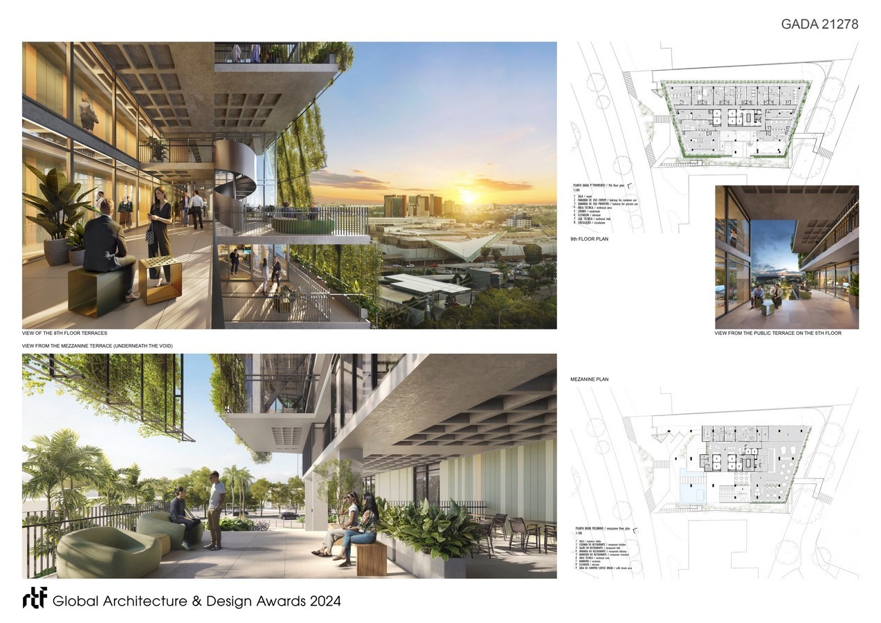 This void, shaded by its very shape, was conceived as a visual and physical extension of the public space to encourage social and corporate gatherings on the numerous public terraces. The public space also permeates the first floor of the building to connect the sidewalk to the shopping mall, located behind the Botânica Office, integrating this horizontal public axis with the vertical one of the terraced void. The public void is crowned by a rooftop that houses a bar and restaurant with panoramic views over the city.