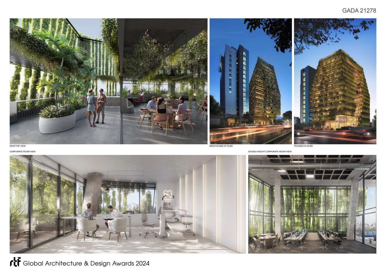 As mentioned above, the benefits of integrating nature into architecture are numerous, but the system of eaves and climbing vegetation in modular systems brings other originalities and innovations: 10 types of climbing plants will be planted that will generate an evolving landscape depending on the seasons; the green façade will not be used as a green wall with a masonry background, as in most green façades, as the climbing plants will be used in front of a simple glass skin to generate a natural filter from the setting sun and create a natural and pleasant atmosphere in the work environments inspired by the sunlight that passes through the canopy of the Amazon rainforest. From various work environments, the city skyline blends with the light filtered by the vines.