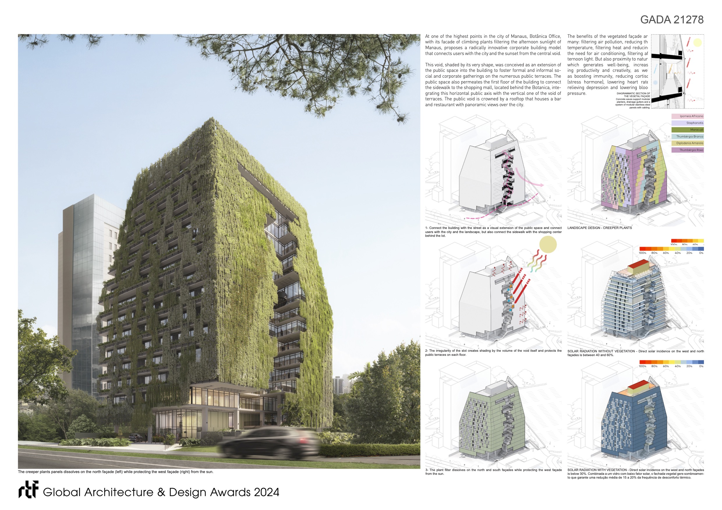 The benefits of the vegetated façade are many: air pollution filtration, temperature reduction, heat filtration, reducing the need for air conditioning, filtering afternoon light by allowing the use of simple, colorless glass, reducing the glare that is very common in Amazonian latitudes and reducing the need for artificial light. In addition to these benefits, there are also health benefits, such as proximity to nature, which generates well-being, increasing productivity and creativity, as well as boosting immunity, reducing cortisol (stress hormone), lowering heart rate, relieving depression and lowering blood pressure.