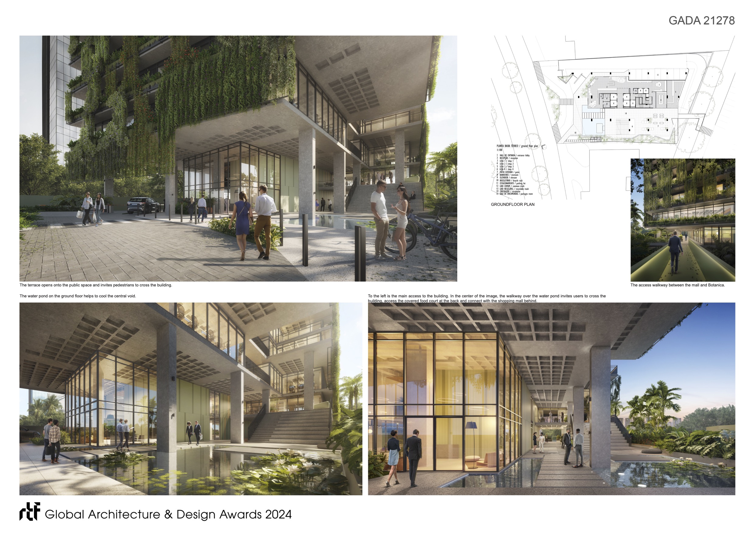 This void, shaded by its very shape, was conceived as a visual and physical extension of the public space to encourage social and corporate gatherings on the numerous public terraces. The public space also permeates the first floor of the building to connect the sidewalk to the shopping mall, located behind the Botânica Office, integrating this horizontal public axis with the vertical one of the terraced void. The public void is crowned by a rooftop that houses a bar and restaurant with panoramic views over the city.