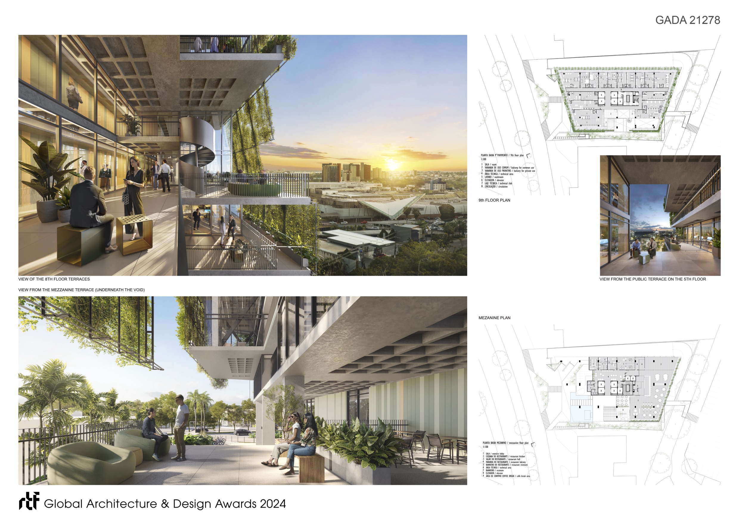 As mentioned above, the benefits of integrating nature into architecture are numerous, but the system of eaves and climbing vegetation in modular systems brings other originalities and innovations: 10 types of climbing plants will be planted that will generate an evolving landscape depending on the seasons; the green façade will not be used as a green wall with a masonry background, as in most green façades, as the climbing plants will be used in front of a simple glass skin to generate a natural filter from the setting sun and create a natural and pleasant atmosphere in the work environments inspired by the sunlight that passes through the canopy of the Amazon rainforest. From various work environments, the city skyline blends with the light filtered by the vines.