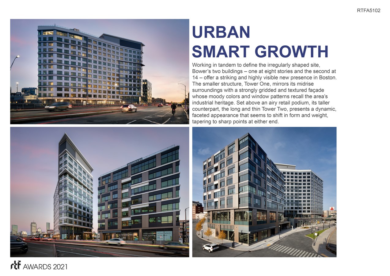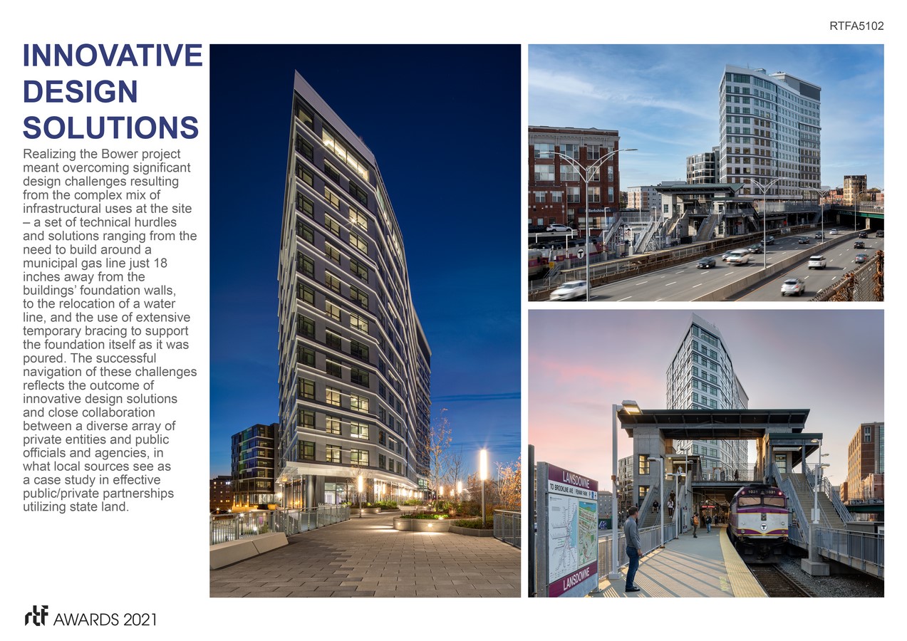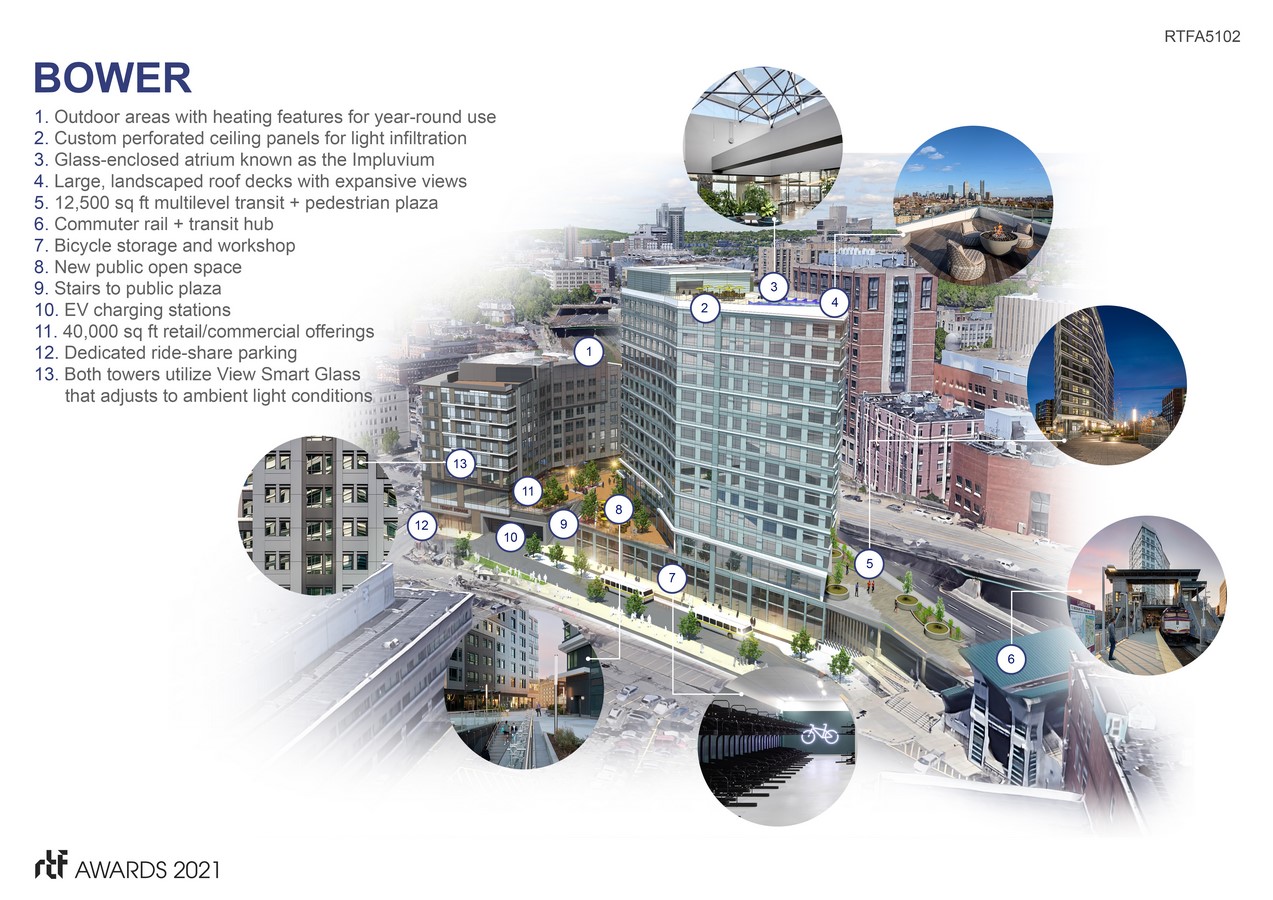 Built on what was previously an underutilized site, Bower helps fill a longstanding gap in Boston’s urban network created by highway construction in the 1960s. Its design employs clever massing of the two structures – which rise in height and scale from historic Beacon Street to the highway – and the creation of the new public plaza whose meandering paths link the buildings and provide, for the first time, a fully accessible pedestrian connection with a 23-foot grade disparity between Beacon Street down to David Ortiz Drive and Fenway Park below.