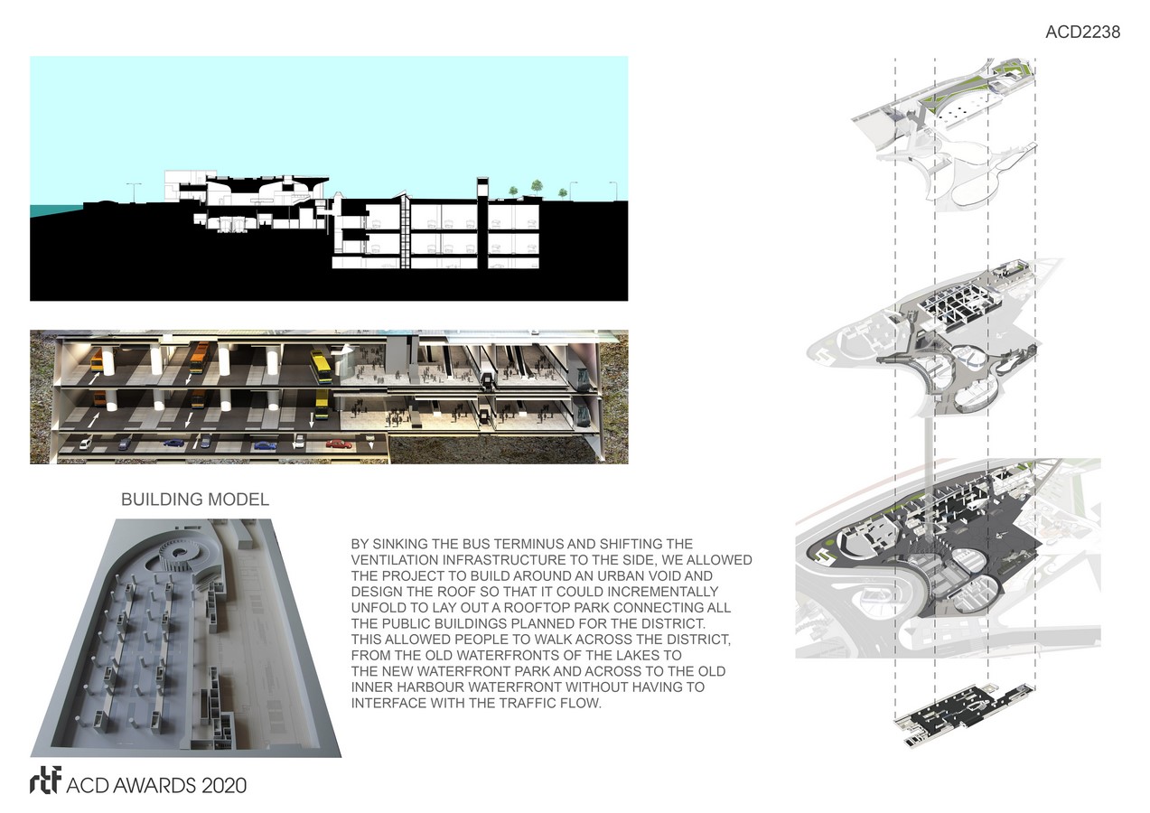By sinking the bus terminus and shifting the ventilation infrastructure to the side, we allowed the project to build around an urban void and design the roof so that it could incrementally unfold to lay out a rooftop park connecting all the public buildings planned for the district, including a border crossing building to mainland China, the Maritime Museum, and Station 12.