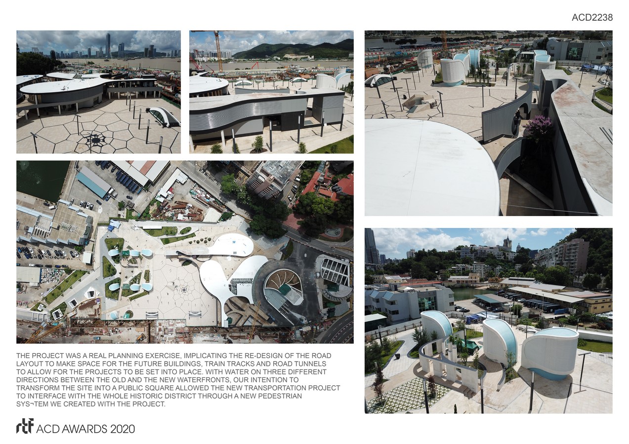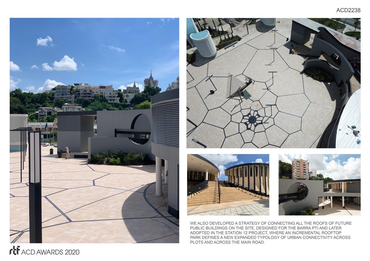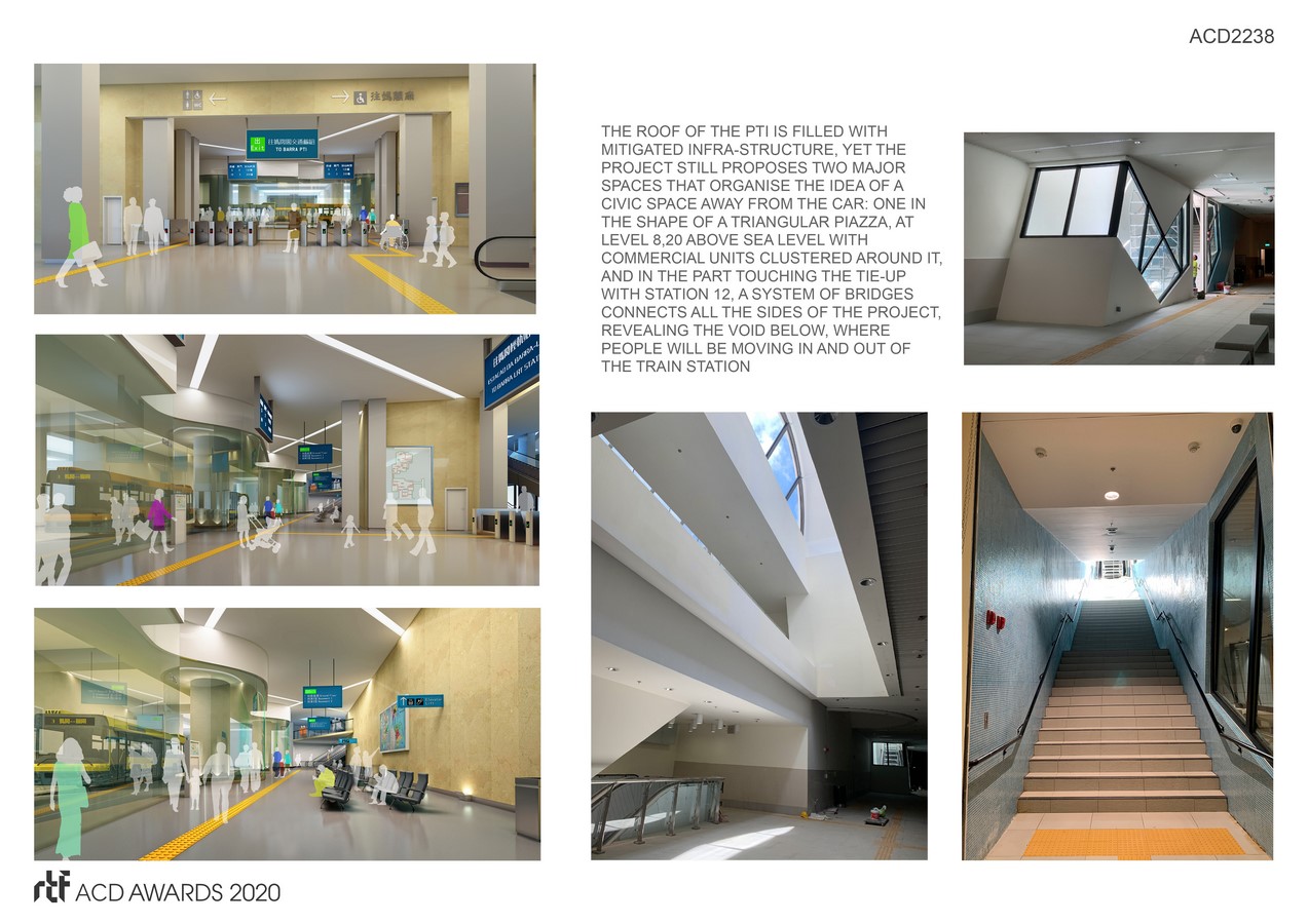 The building is formed by three basements floors and two over ground floors organized in a double deck public space. The 2 underground levels of public bus terminus are at grade with LRT Station 12 platforms. The Barra PTI project is articulated with the LRT Station to optimize the transfer between Train, Bus, Taxis and private car, and provide an easy, seamless experience of the Ma Kok and inner Harbour Historical District.